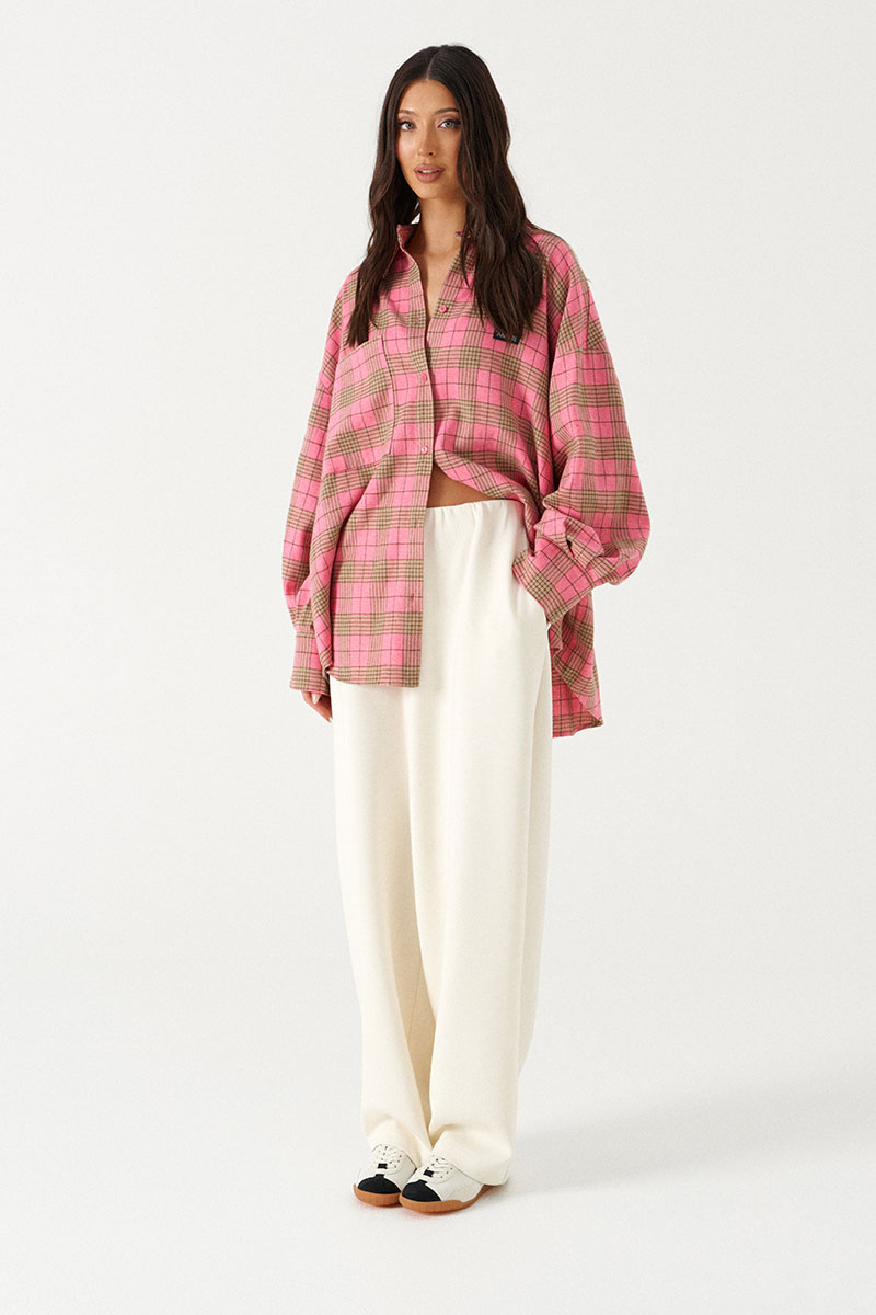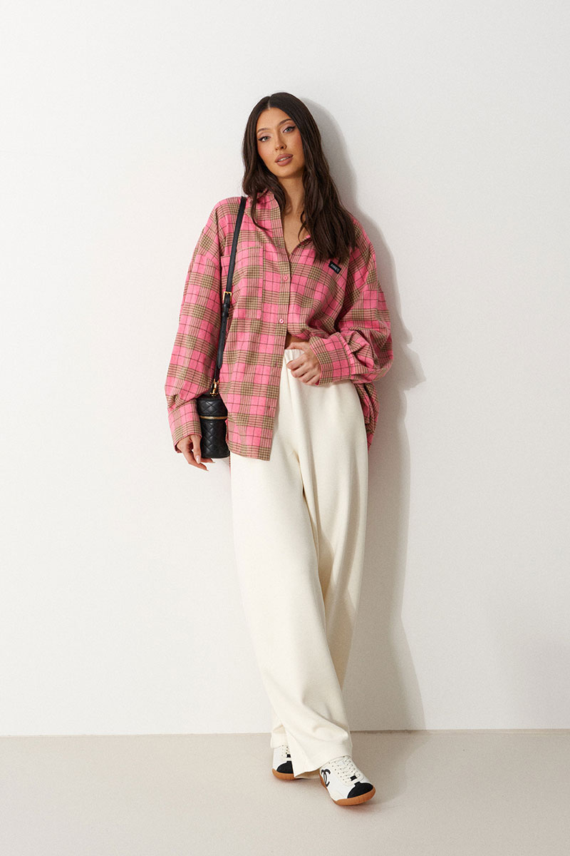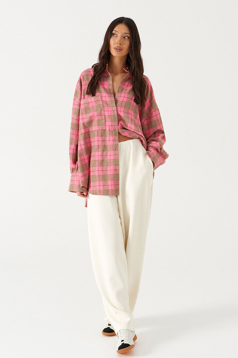 Рубашка прямого свободного кроя, выполнена из ворсистого полотна розового цвета в коричневую клетку. Характеристика: воротник отложной, застёжка центральная на пуговицы, по переду справа на уровне линии груди карман, слева - брендированная нашивка Annete, рукав спущенный свободный, с широкой манжетой на пуговице, спинка отрезная с скоалками.