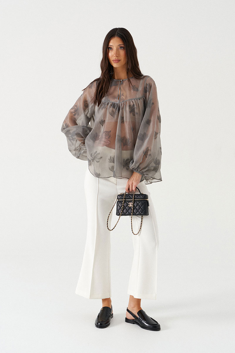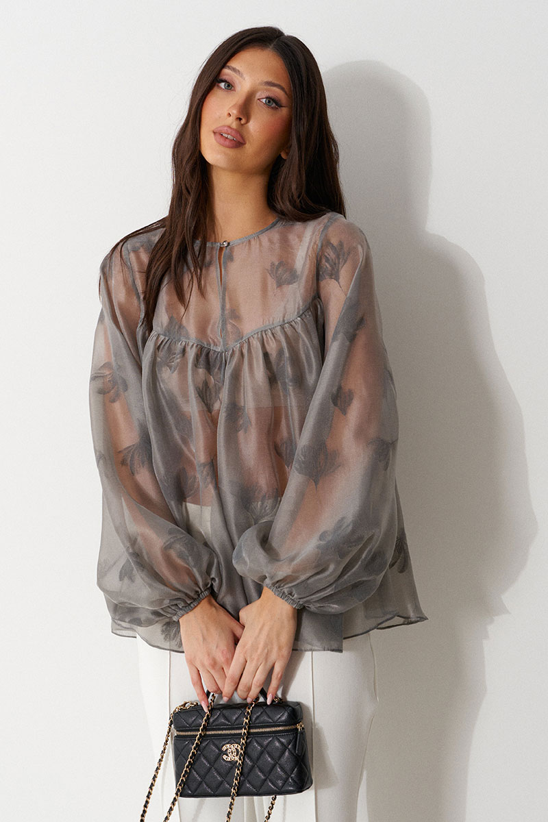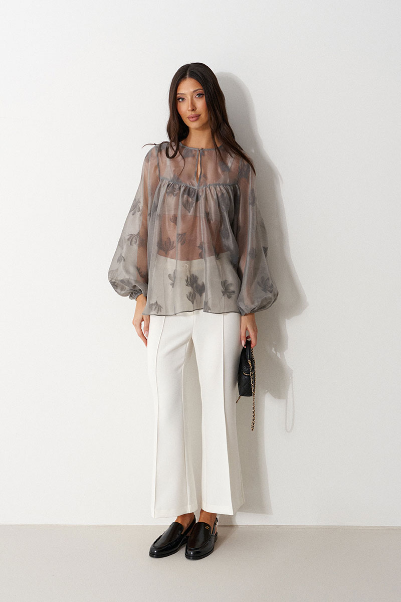Блуза свободного кроя. Выполнена из прозрачной ткани серого цвета. Горловина круглая. Рукав втачной, внизу на резинке. Застёжка центральная - пуговка. Спинка и передняя части отрезные со сборкой.