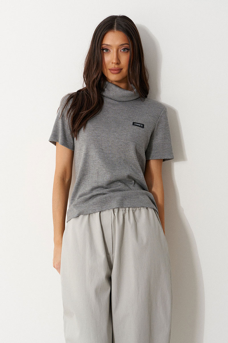 Джемпер прямого кроя. Выполнен из мягкого трикотажа серого цвета. Без подкладки. Воротник стойка. Рукав втачной. По переду слева на уровне груди брендированная нашивка.
