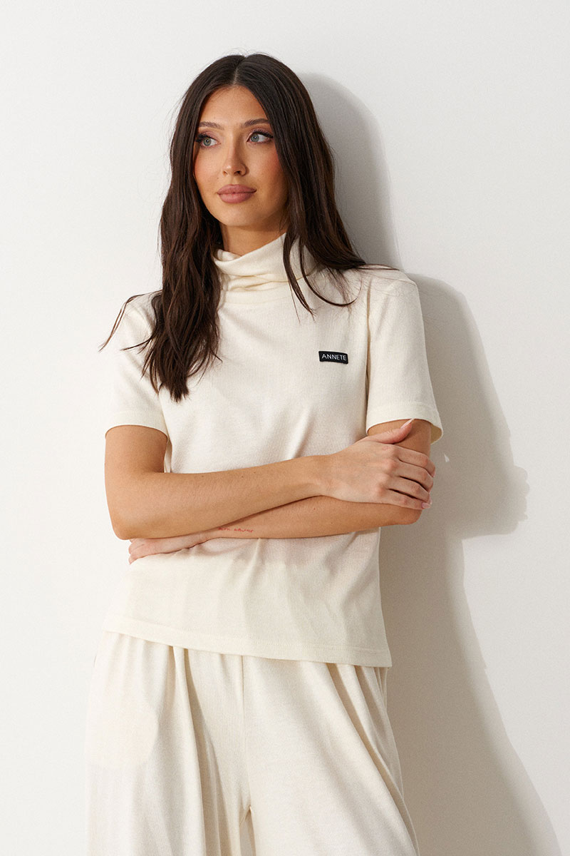 Джемпер прямого кроя. Выполнен из мягкого трикотажа молочного цвета. Без подкладки. Воротник стойка. Рукав втачной. По переду слева на уровне груди брендированная нашивка.