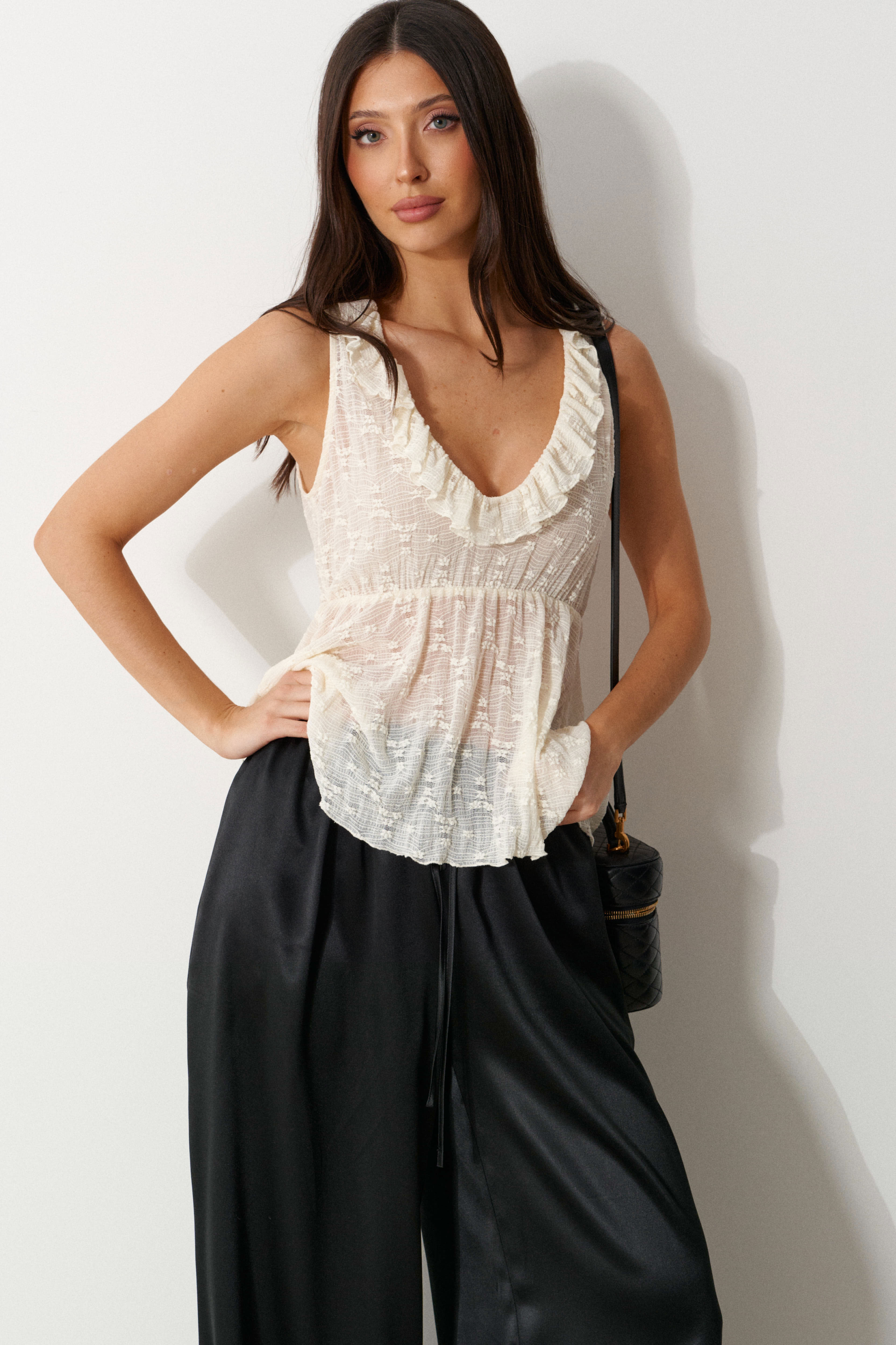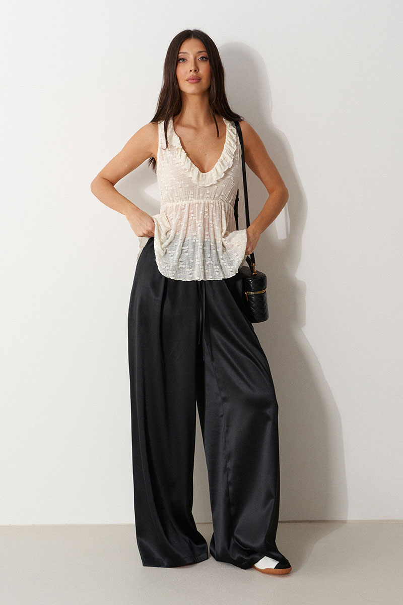 Топ полуприлегающего силуэта. Выполнена из трикотажного полотна. Характеристики: приталенный силуэт, без рукавов, вырез горловины круглый, глубокий по переду , по всей окружности притачана рюша, по талии джемпер разделен и присборен на резинке, низ обработан открытым срезом.