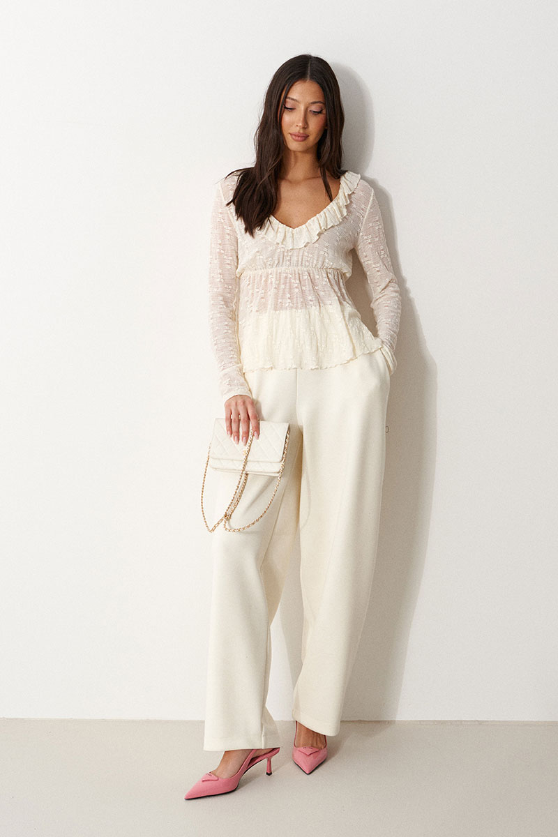 Джемпер полуприлегающего силуэта. Выполнен из трикотажного полотна. Характеристики: приталенный силуэт, без рукавов, вырез горловины круглый, глубокий по переду , по всей окружности притачана рюша, по талии джемпер разделен и присборен на резинке, низ обработан открытым срезом.
