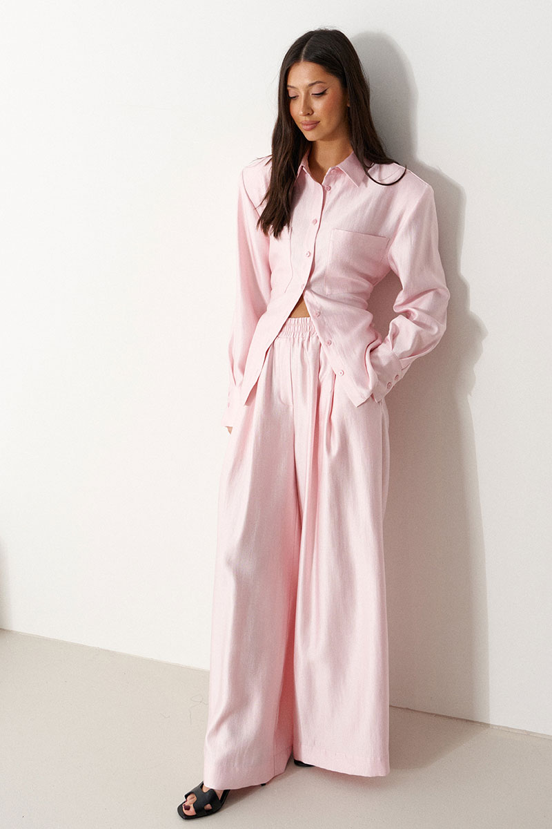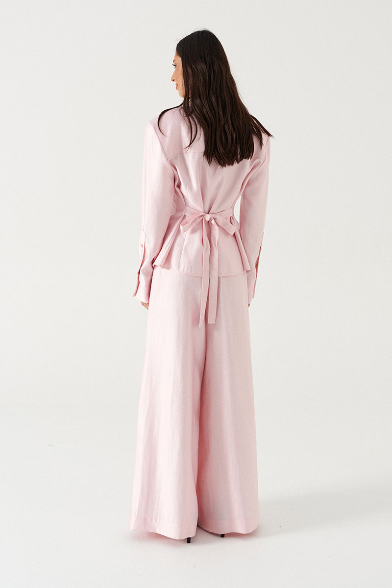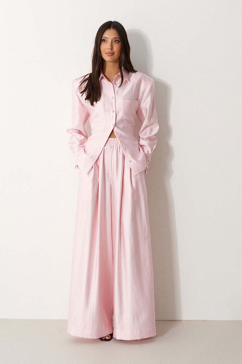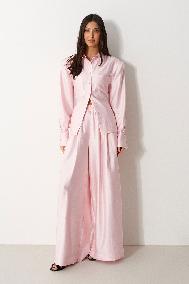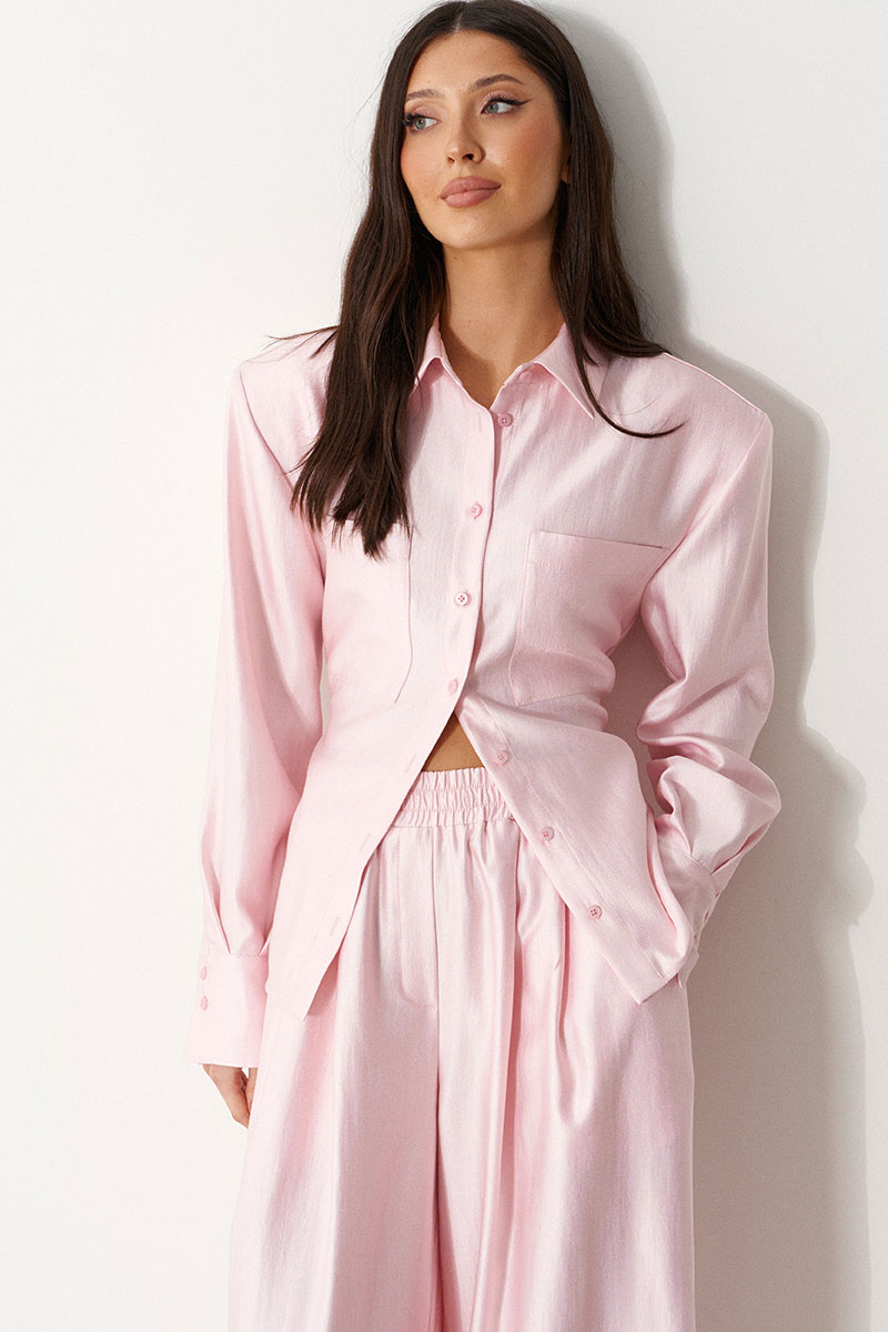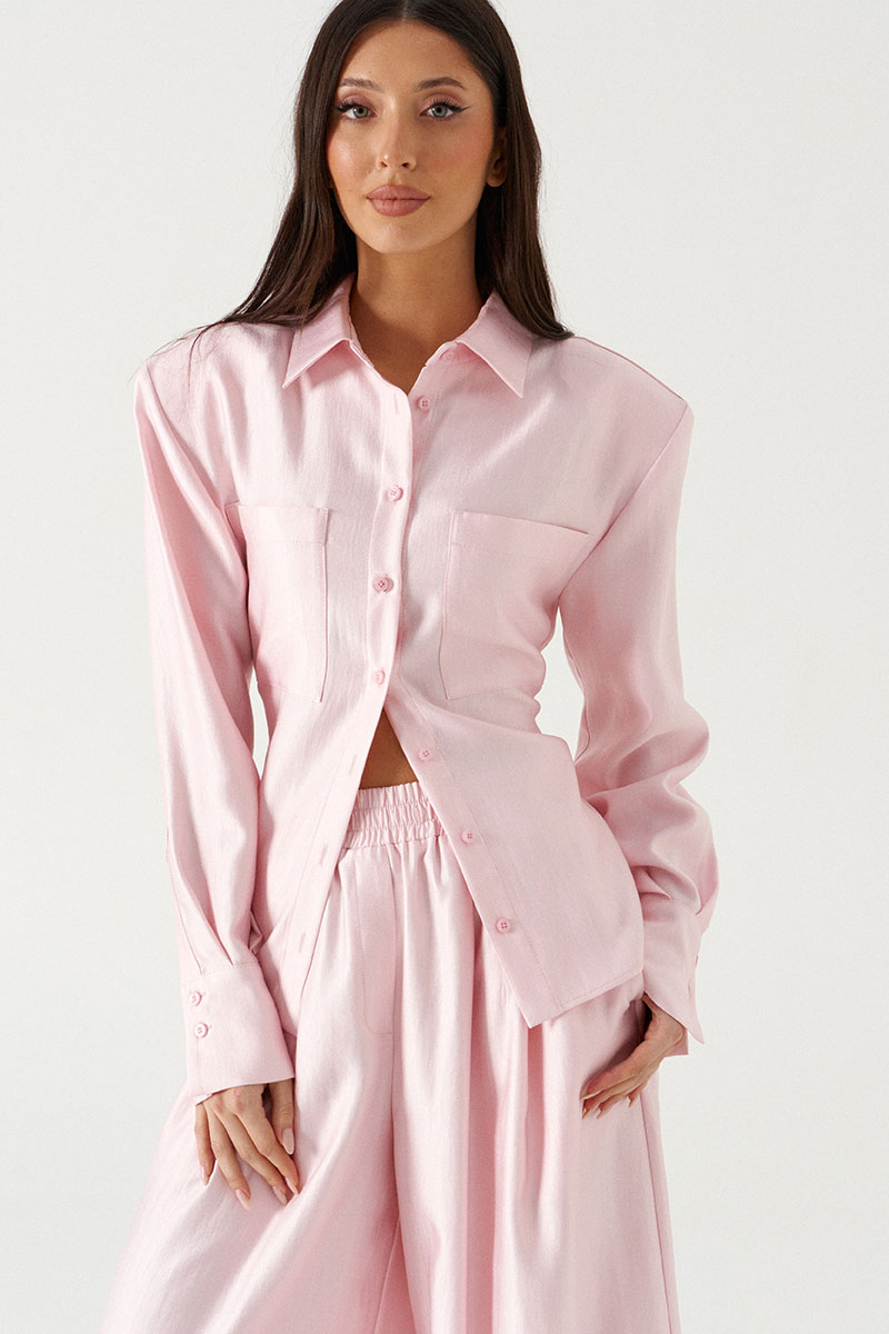 Рубашка полуприлегающего силуэта выполнена изтекстильного полотна розового цвета. Характеристики: полуприлегающий силуэт, воротник рубашечный, по переду в области груди накладные карманы, линия плеча расширена, есть подплечники (съёмные), рукав втачной, по низу рукава широкая манжета с двумя пуговицами, застёжка - центральная петли-пуговицы, в боковых швах пояс, спинка отрезная.
