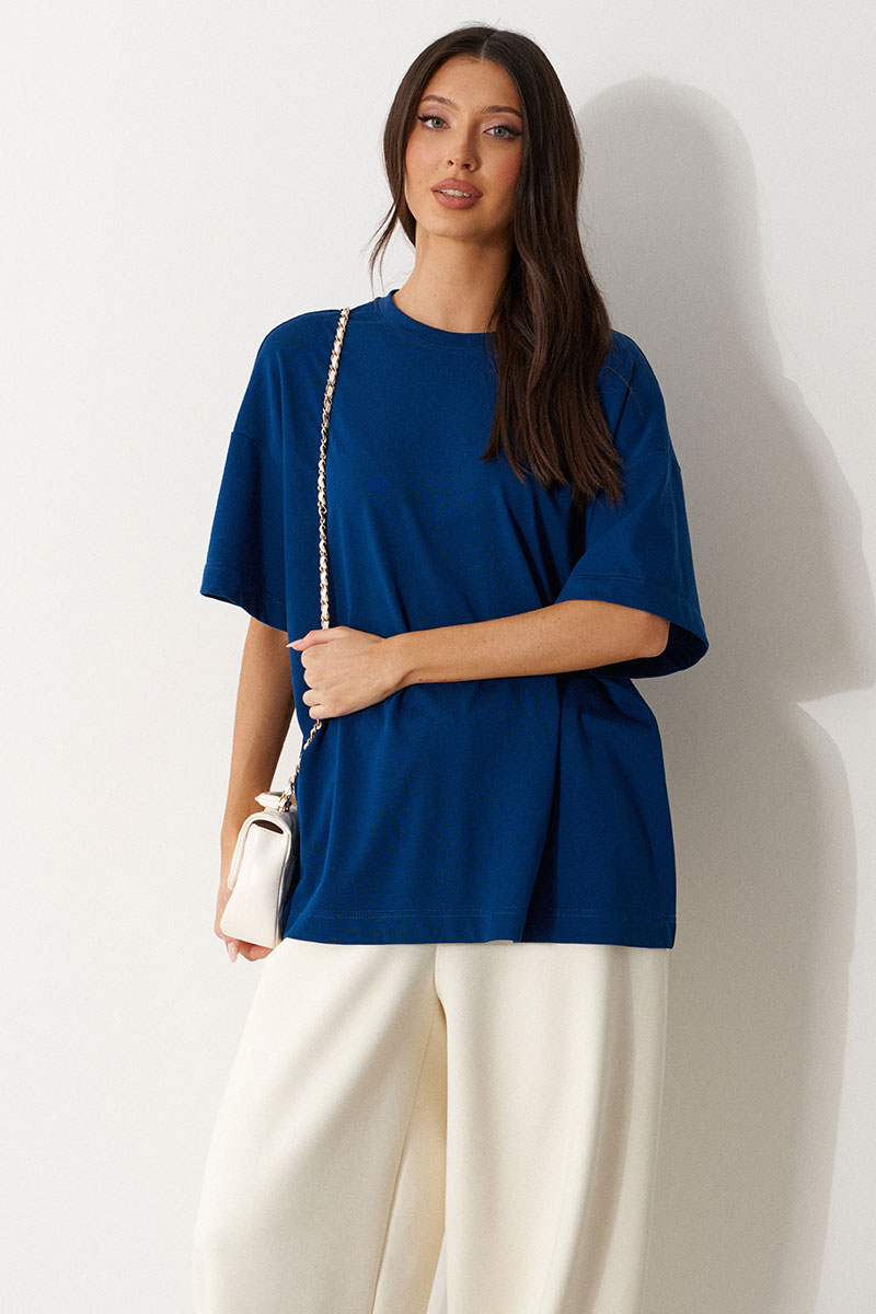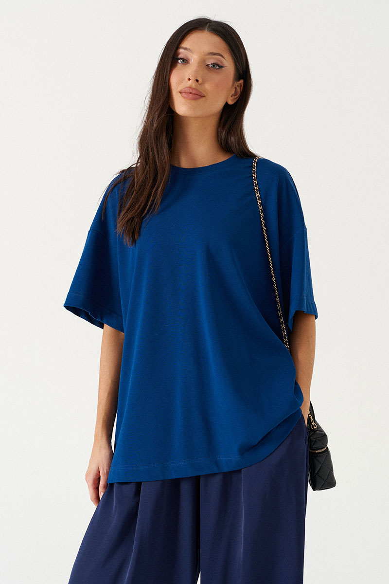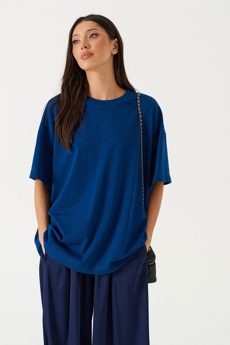 Футболка прямого свободного кроя, выполнена из хлопкового полотна глубокого синего цвета. Характеристики: прямой свободный крой, горловина овальная, край выполнен из довяза, рукав слегка спущен, по центру спинки изделия, под горловиной брендированная нашивка "Annete".