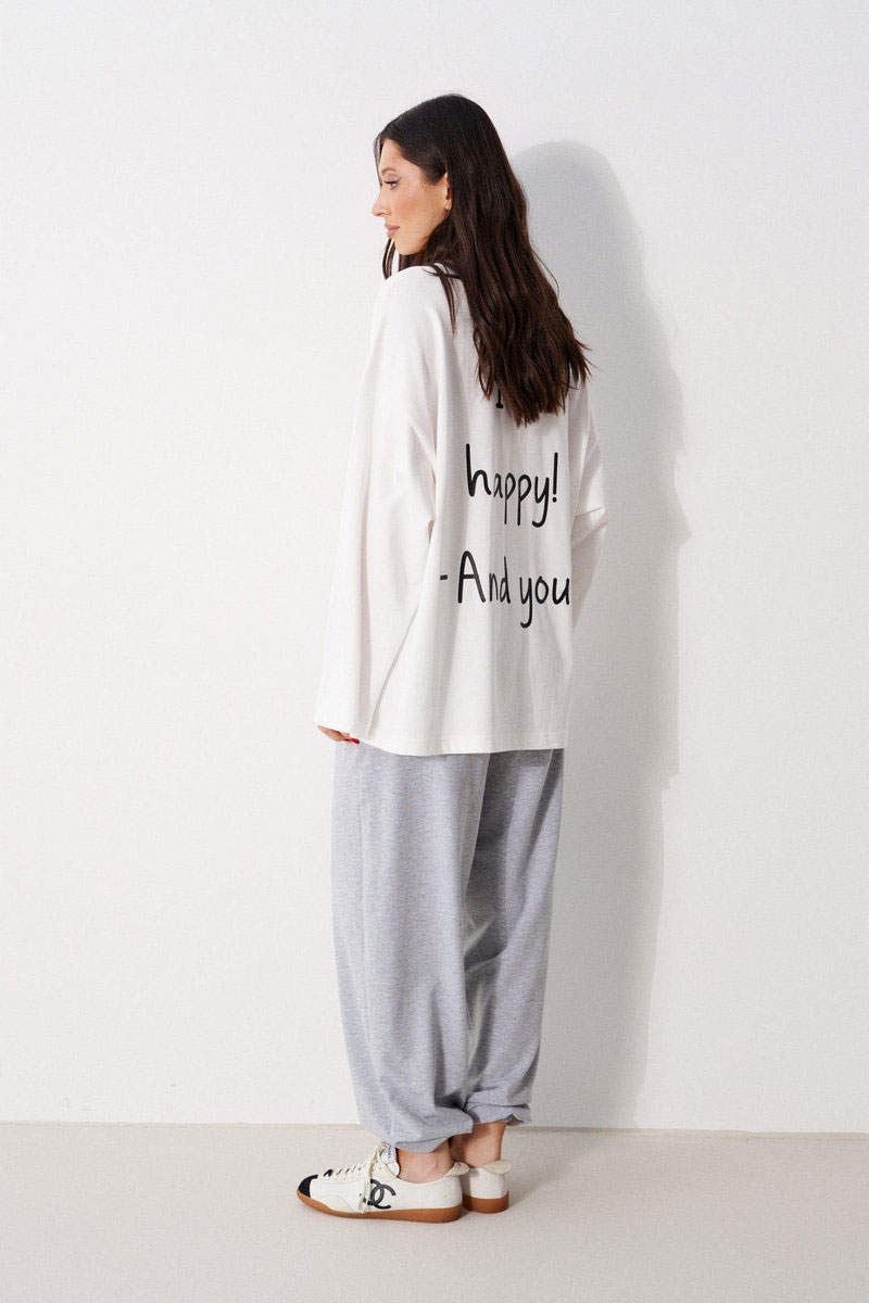 Джемпер прямого свободного кроя, выполнен из трикотажного полотна белого цвета. Характеристики: прямой крой, овальный вырез горловины, горловины из довяза, спинка цельнокроеная, Ппринт "I'm happy! And you?", спущенное плечо, вточной длинный рукав.
