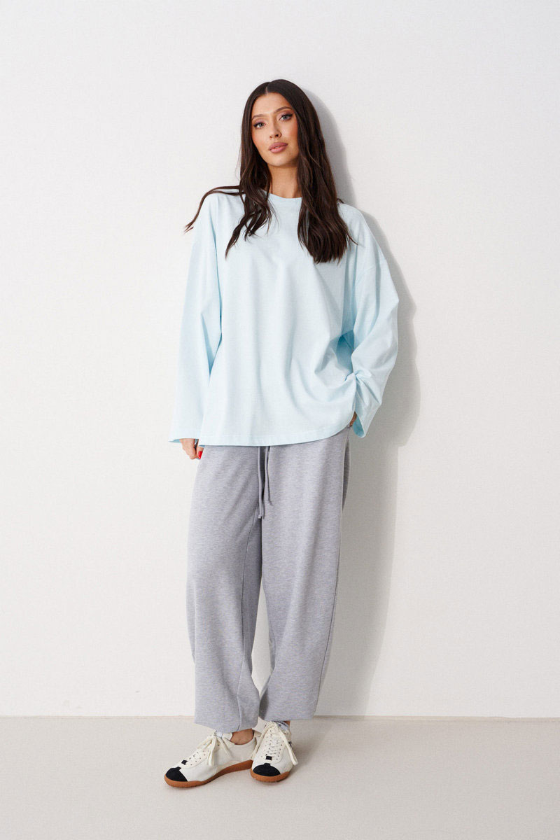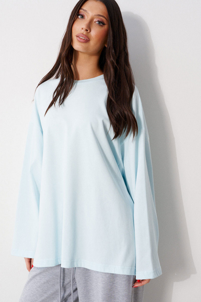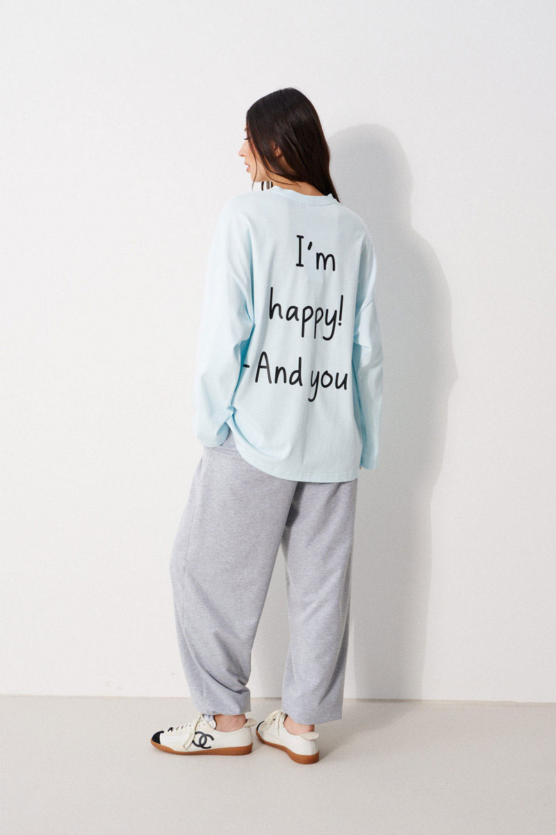 Джемпер прямого свободного кроя, выполнен из трикотажного полотна голубого цвета. Характеристики: прямой крой, овальный вырез горловины, горловины из довяза, спинка цельнокроеная, Ппринт "I'm happy! And you?", спущенное плечо, вточной длинный рукав.