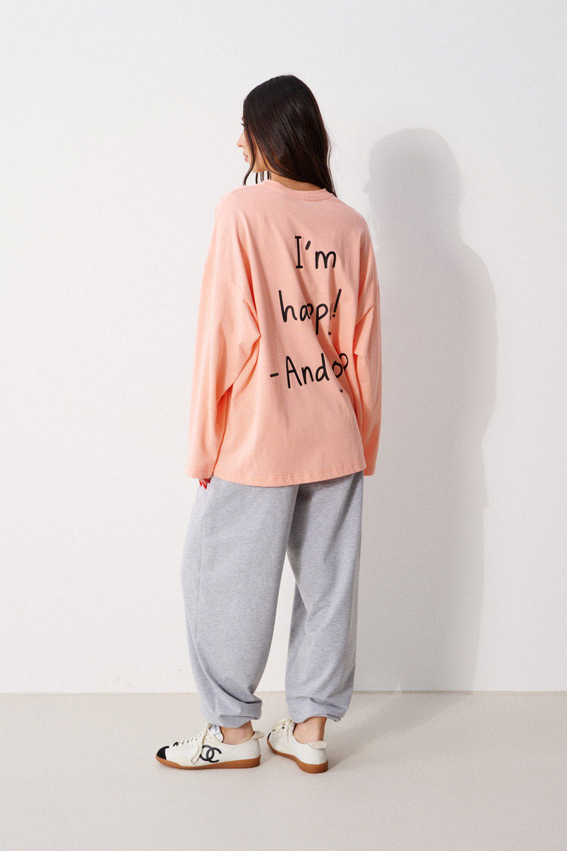 Джемпер прямого свободного кроя, выполнен из трикотажного полотна. Характеристики: прямой крой, овальный вырез горловины, горловины из довяза, спинка цельнокроеная, Ппринт "I'm happy! And you?", спущенное плечо, вточной длинный рукав.