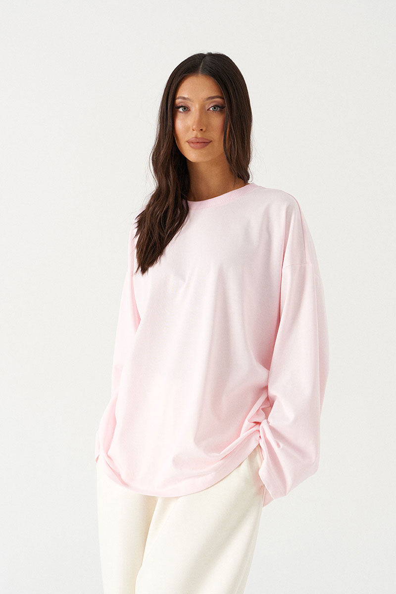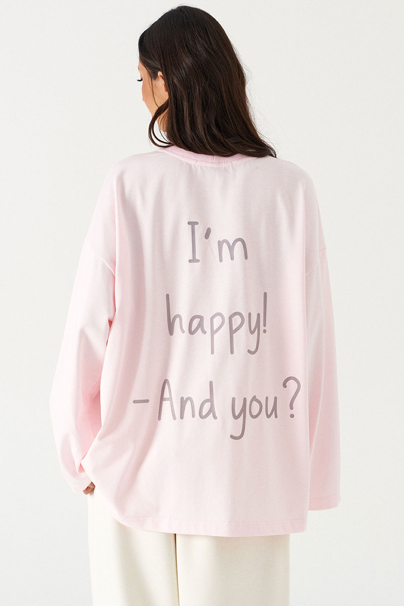 Джемпер прямого свободного кроя,выполнен из трикотажного полотна розового цвета. Характеристики: прямой крой, овальный вырез горловины, горловины из довяза, спинка цельнокроеная, Ппринт "I'm happy! And you?", спущенное плечо, вточной длинный рукав.