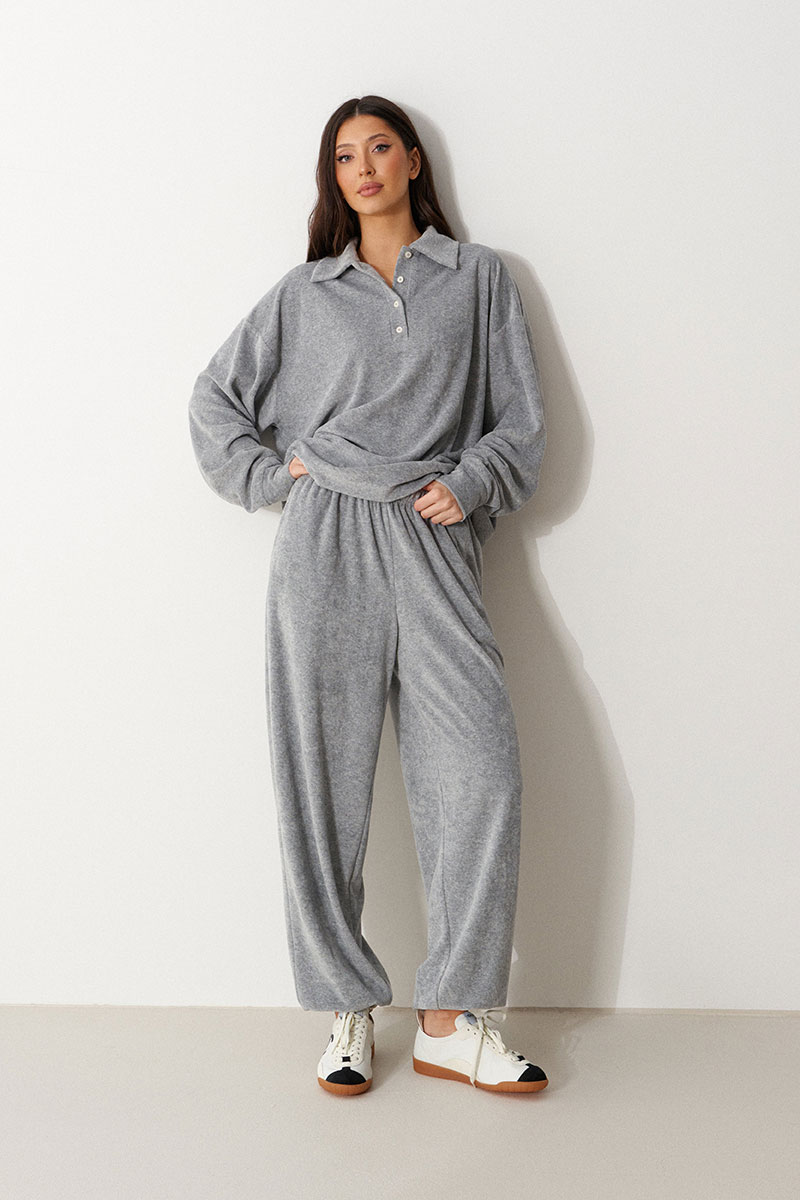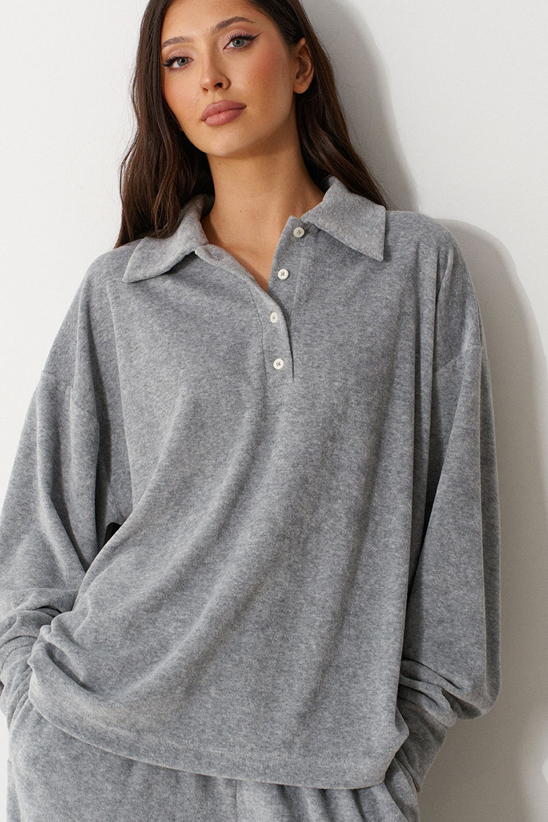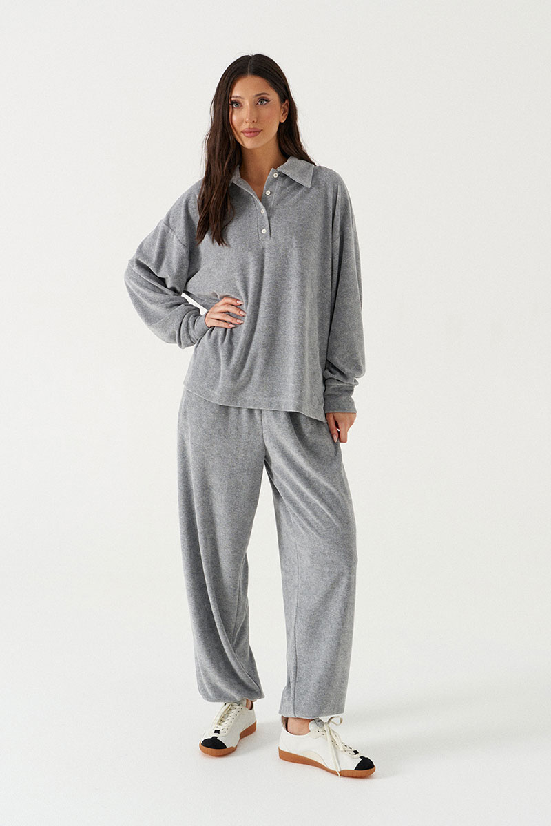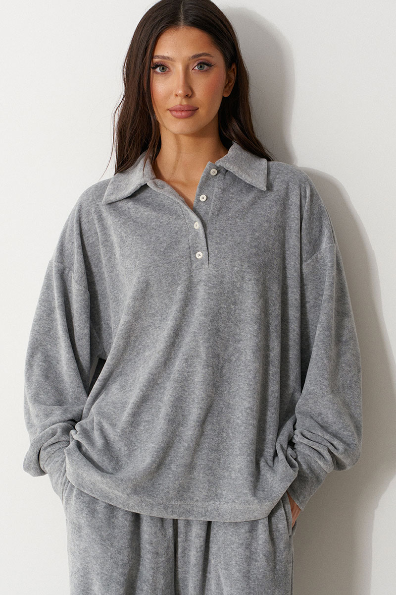Джемпер прямого кроя выполнен из трикотажного полотна серого цвета. Характеристики: горловина круглая с отложным воротником и планкой-поло, застегивающейся на пробивные петли и пришивные пуговицы, линия плеча спущенная, рукав втачной с притачной манжетой по низу.