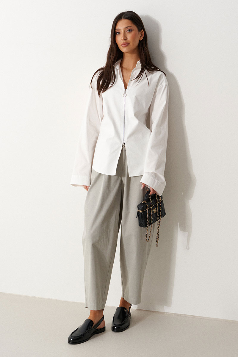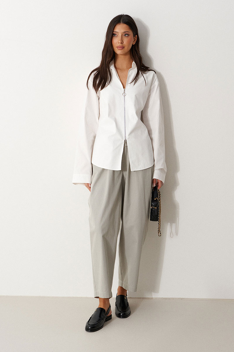 Блузка полуприталенного силуэта выполнена из плотного хлопкового полотна белого цвета. Характеристики: двойная полочка, отлжной воротник, застежка-молния с возможностью открытия с двух сторон, расклешенный рукав, отрезная спинка.