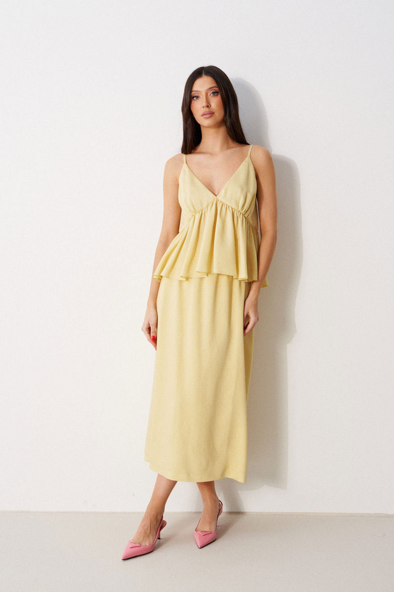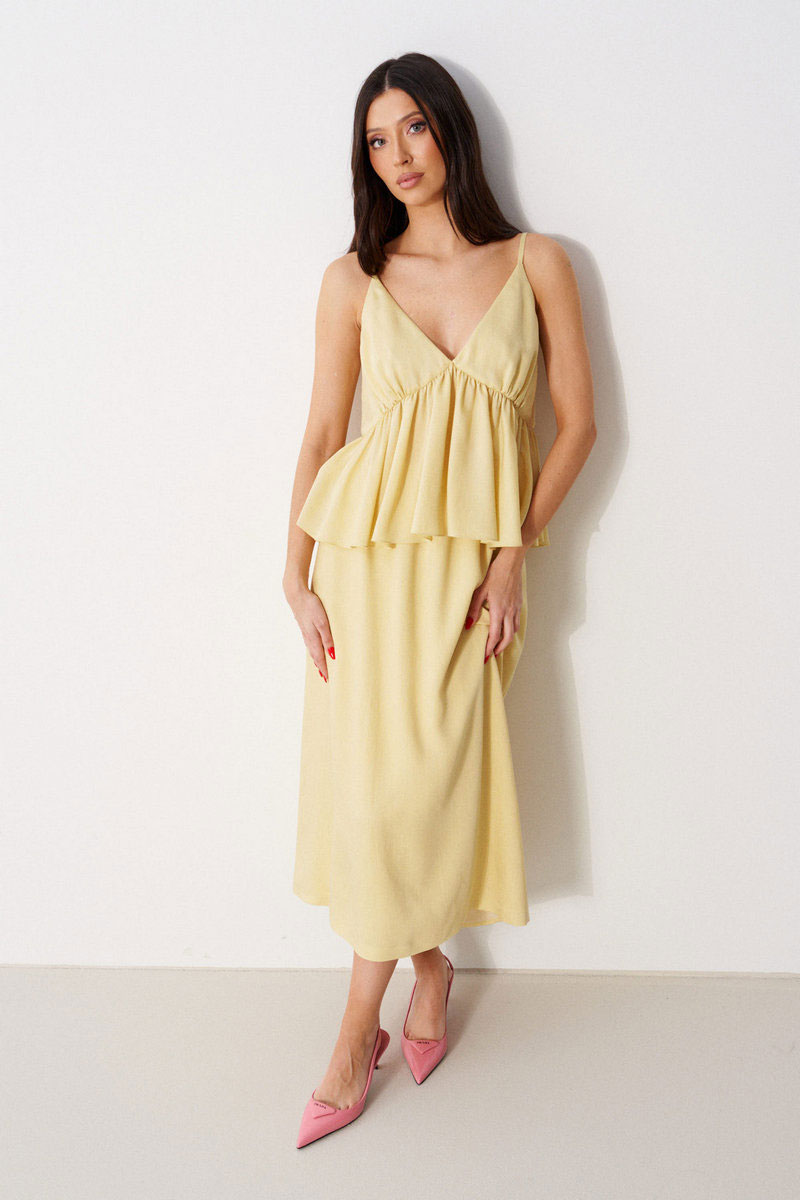 Топ свободного кроя с акцентным лифом, выполнен из мягкой струящейся ткани. Характеристика: V-образный вырез декольте, на регулируемых бретелях, лиф двойной, с фигурным отрезом, спинка закрытая.