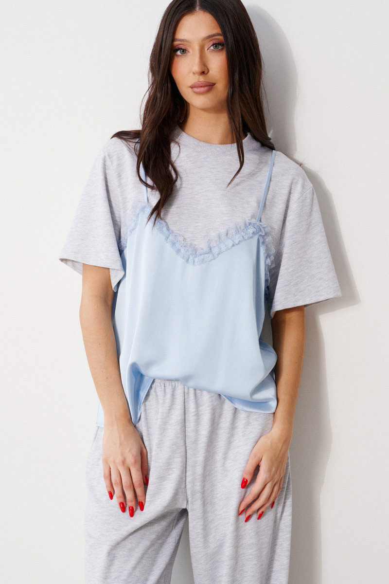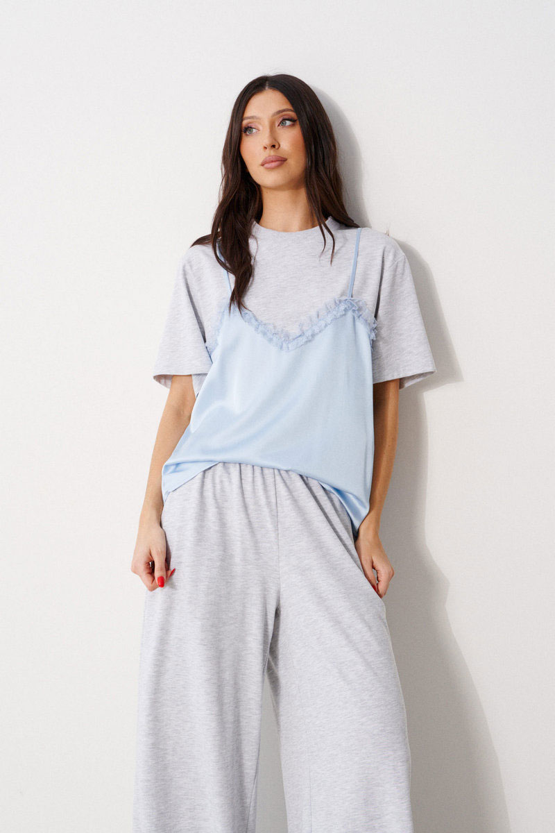 Футболка свободного кроя с имитацией топа (изделие однослойное). Выполнено из хлопкового и мягкого струящего полотна в сером и в голубом цвете. Имитированный топ по переду и спинке с кружевом. Вырез горловины круглый.