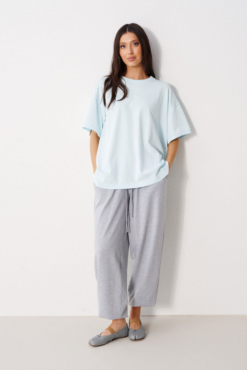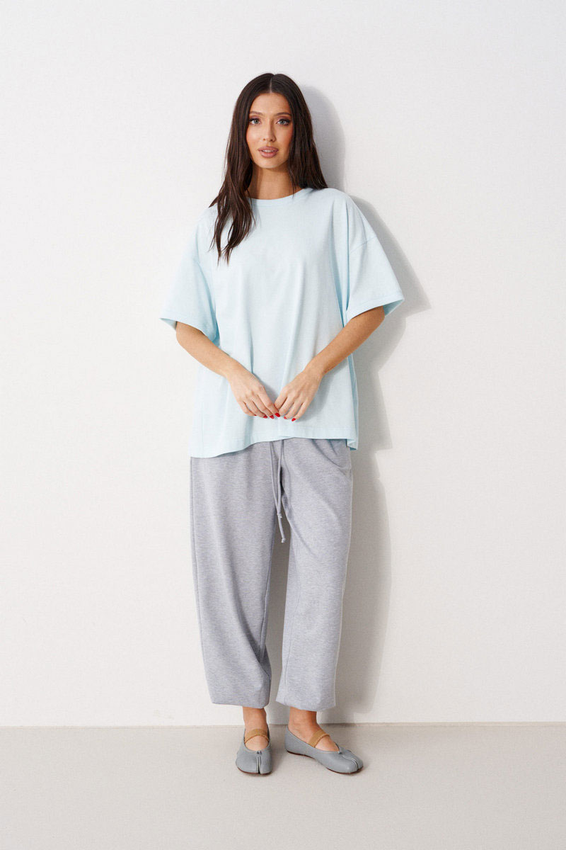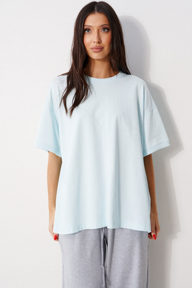 Футболка прямого свободного кроя, выполнена из трикотажного полотна голубого цвета. Характеристика: прямой крой, овальная горловина выполнена из довяза, рукав вточной спущенный, край выполнен из довяза, спинка цельнокраеная, на спинке под горловиной брендированная нашивка "ANNETE".