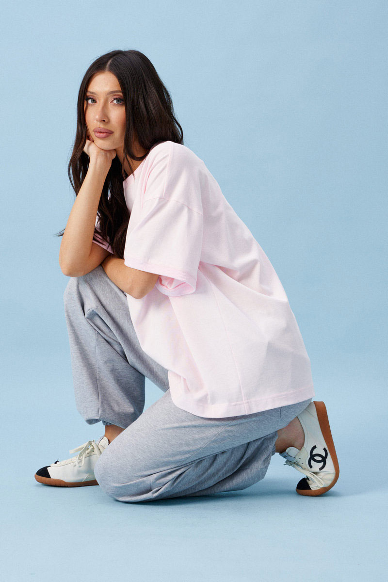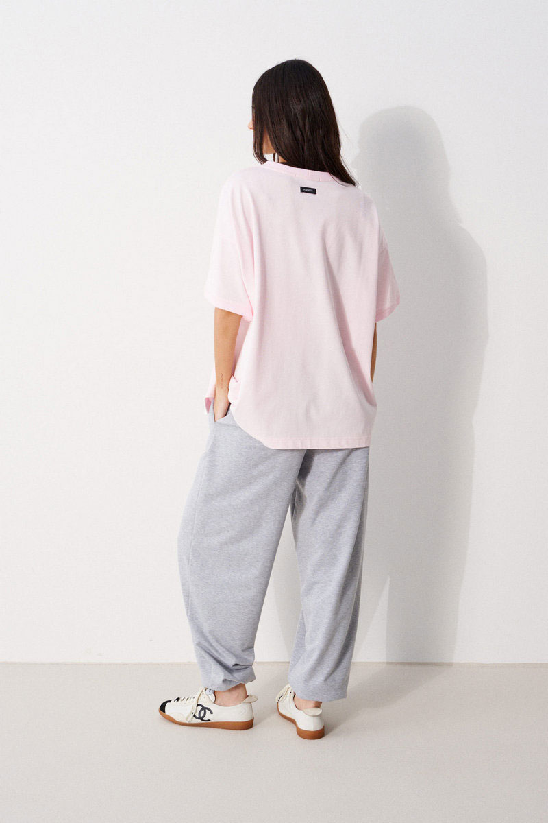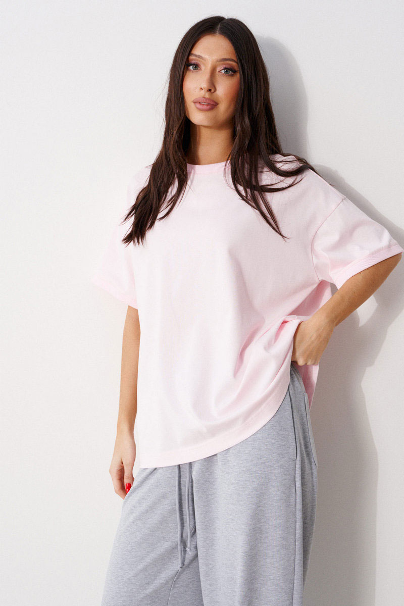 Футболка прямого свободного кроя, выполнена из трикотажного полотна розового цвета. Характеристика: прямой крой, овальная горловина выполнена из довяза, рукав вточной спущенный, край выполнен из довяза, спинка цельнокраеная, на спинке под горловиной брендированная нашивка "ANNETE".