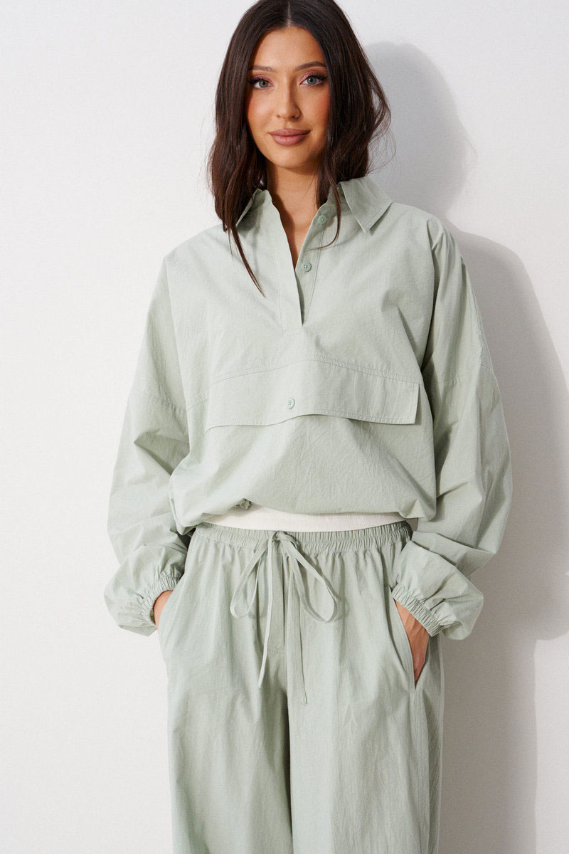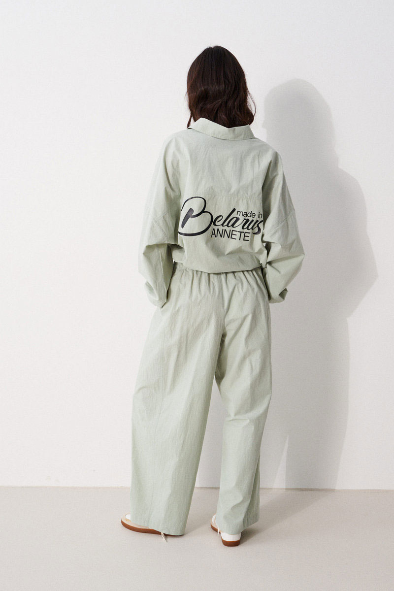 Блузон прямого свободного кроя выполнен из хлопковой ткани, в оттенке светлой оливы. Характеристики: отложной воротник, застежка центральная на петли пуговицы, по переду имитация кармана. Низ изделия на резинке с фиксатором, на спинке расположена надпись "Made in Belarus. Annete". Плечо спущено, рукав свободный, низ рукава на резинке.