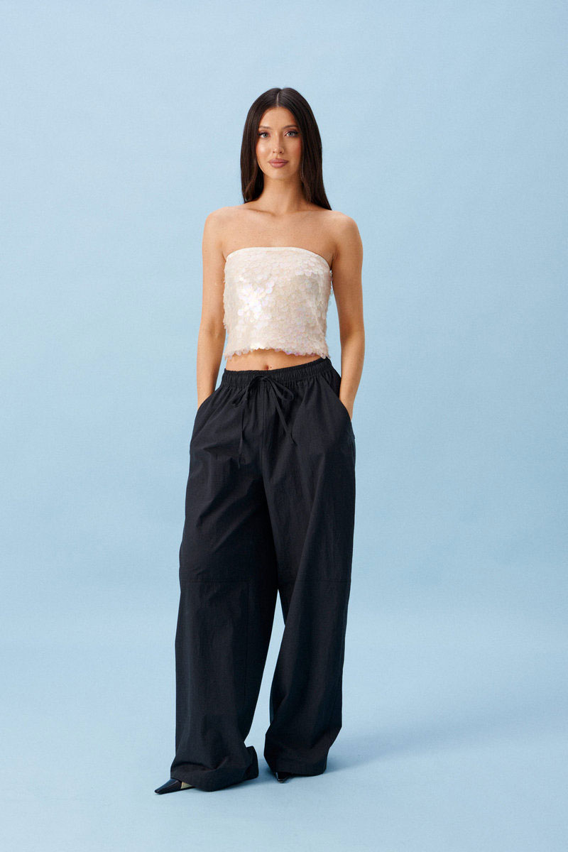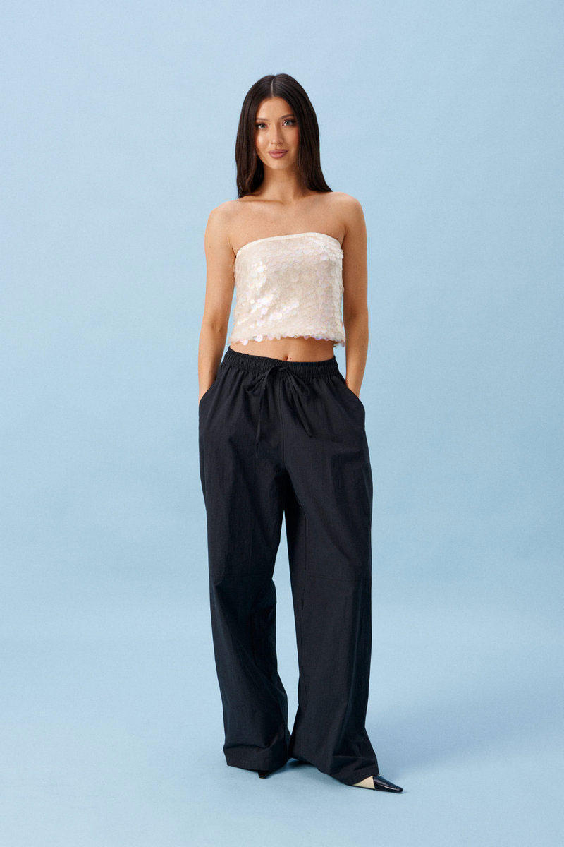 Топ свободного кроя. Выполнен из ткани с пайетками. С подкладкой. Верх на резинке.