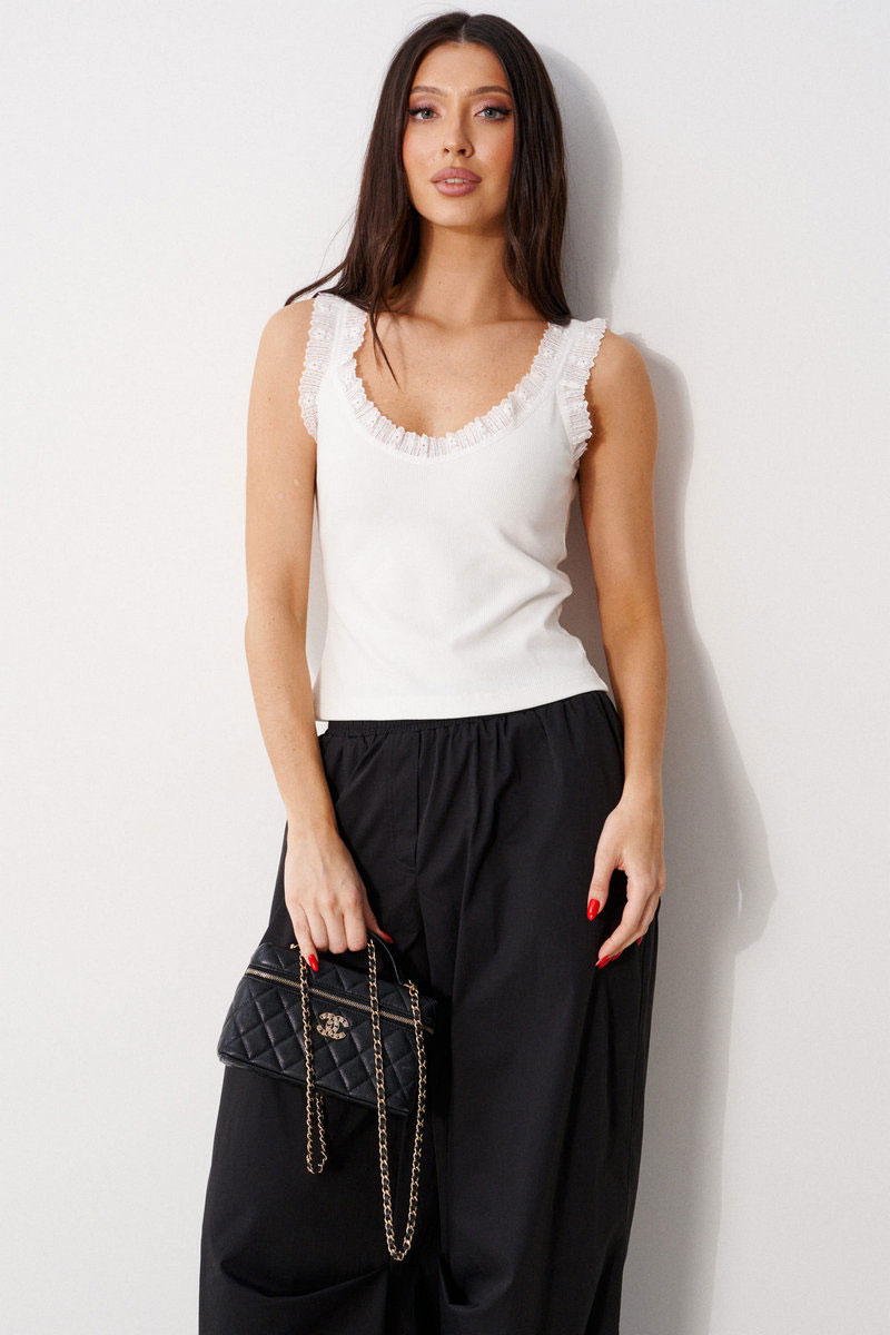 Топ прилегающего силуэта. Выполнен из мягкой трикотажной ткани тёплого белого цвета. Вырез горловины V-образный. По линии выреза горловины и по спинке кружево, переходящее в бретели.