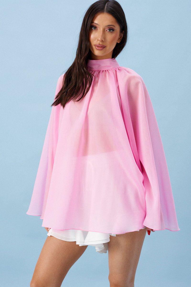 Блузка свободного кроя, выполнена из полупрозрачного полотна розового цвета. Характеристика : свободный крой, воротник стойка сзади на застежке петли пуговицы. Рукав-реглан.
