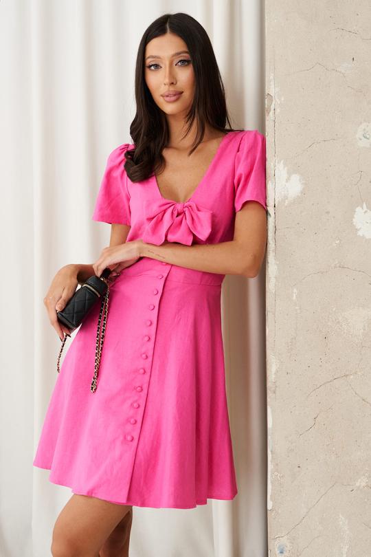 Миниатюрное платье полуприлегающего силуэта выполнено из полотна в цвете фуксия. Характеристики: полуприлегающий силуэт, отрезное, V образный вырез горловины, по низу горловины декоративные детали завязывающиеся на бант, застежка центральная на петли пуговички, пуговички декорированы тканью основного изделия, рукав втачной свободного кроя.