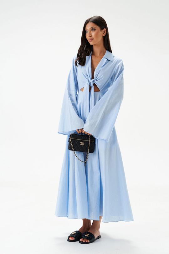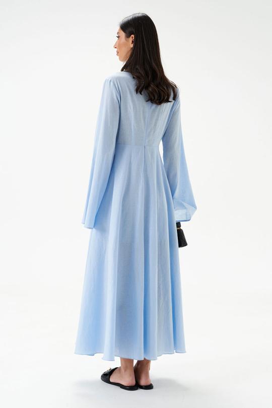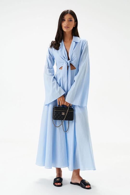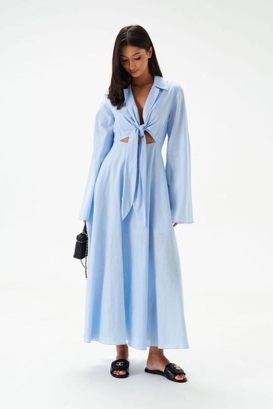 Платье полуприлегающего силуэта, выполнено из текстильного голубого полотна.Характеристики: горловина V образный вырез, грудь фиксируется декоративными детялями завязывающимися на бант, рукав втачной к низу расшмрен, юбка свободного кроя на подкладке, застежка центральная - молния по спинке.