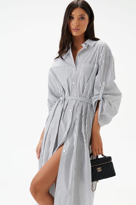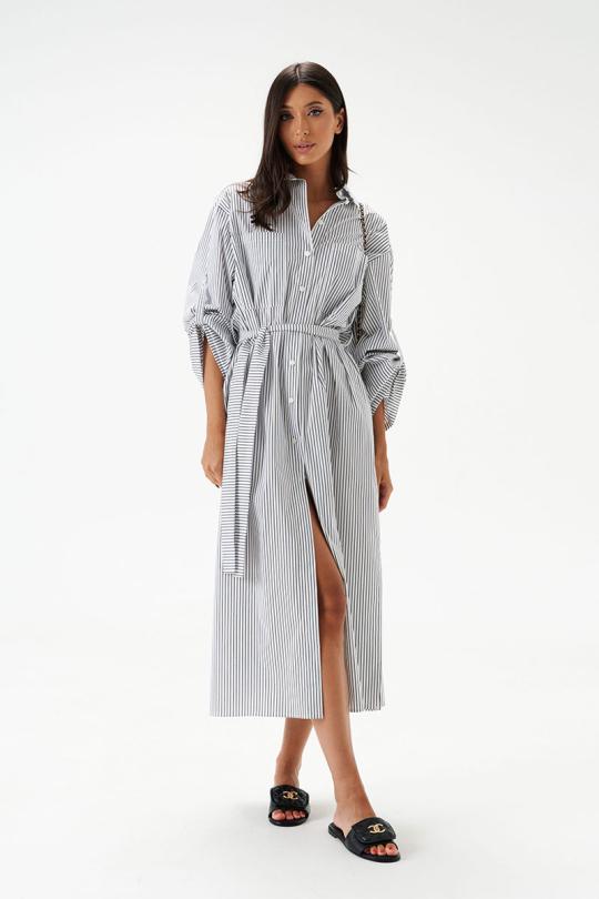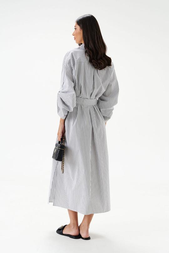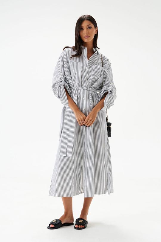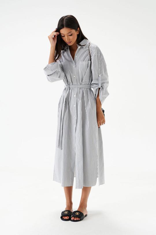 Платье свободного прямого кроя. Характеристики: отложной воротник, застежка центральная на петли пуговицы, талия фиксируется поясом из основной ткани изделия, по переду нашиты функциаональные карманы. Рукав свободного кроя с пуговичкой по середине и скрытым элементом для удержания рукава при сборке. Спинка отрезная.