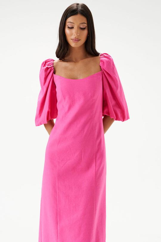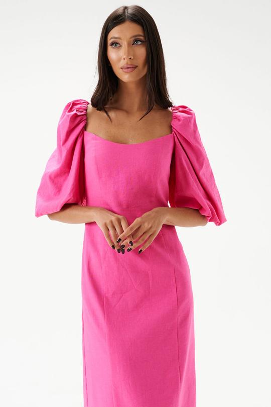 Платье прилегающего силуэта, выполнено из льняного полотна цвета фуксия. Характеристики: подкладка, вырез горловины фигурное «Каре».Рукава короткие, пышной формы, верх и низ рукава на резинке. По переду и спинке рельефные швы.В среднем шве спинки обработана потайная застежка-молния и разрез по низу, длина разреза 48 см.
