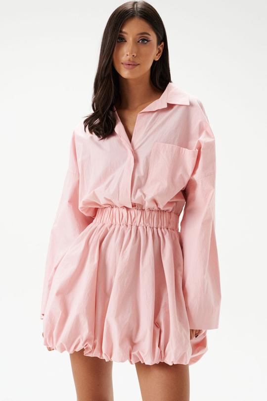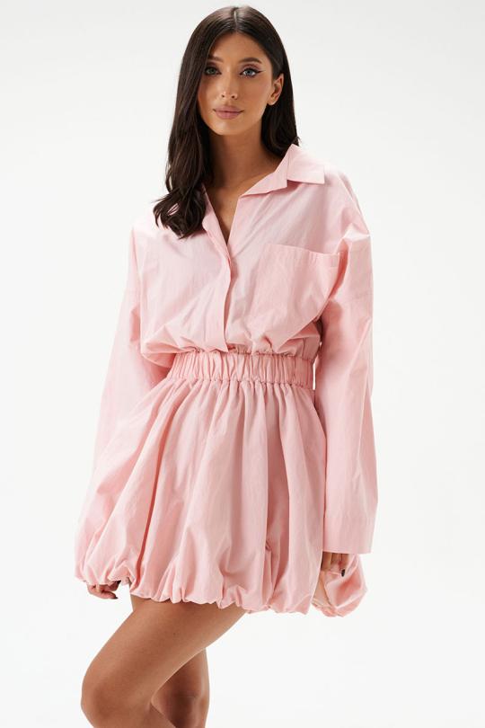 Платье-мини свободного кроя. Выполнено их хлопкового полотна нежно-розового цвета. Воротник отложной. Рукав втачной, спущенный. Слева на уровне груди накладной карман. Застёжка центральная – пуговички (потайная планка). Пояс на резинке. Юбка-баллон, с подкладкой.