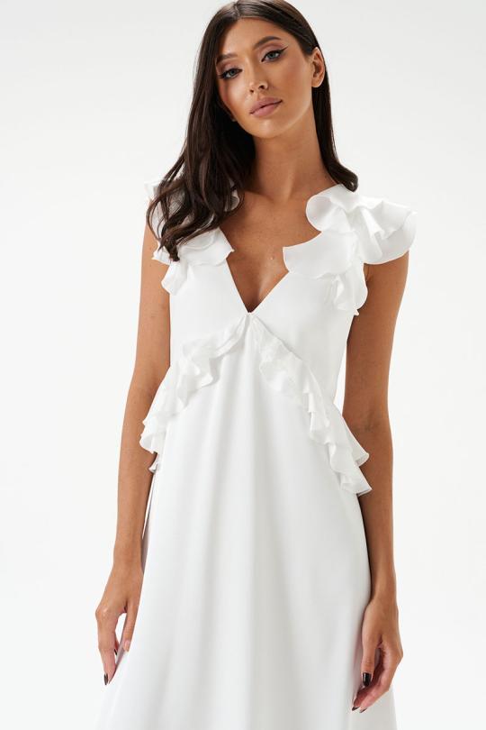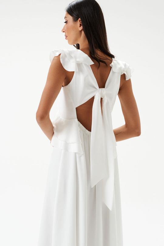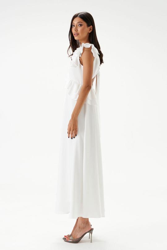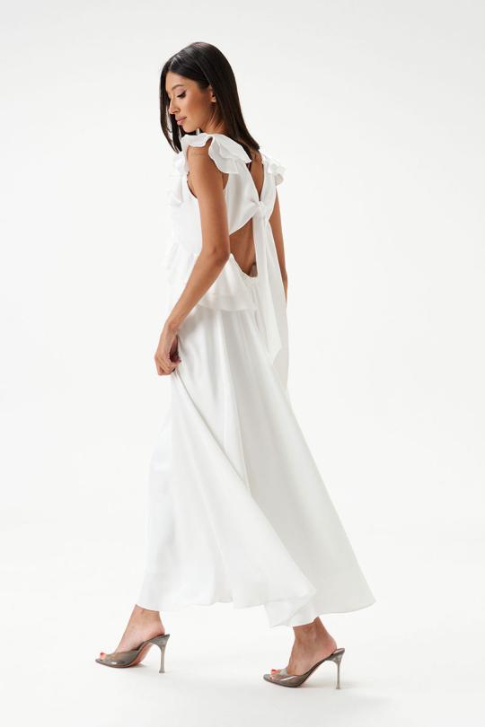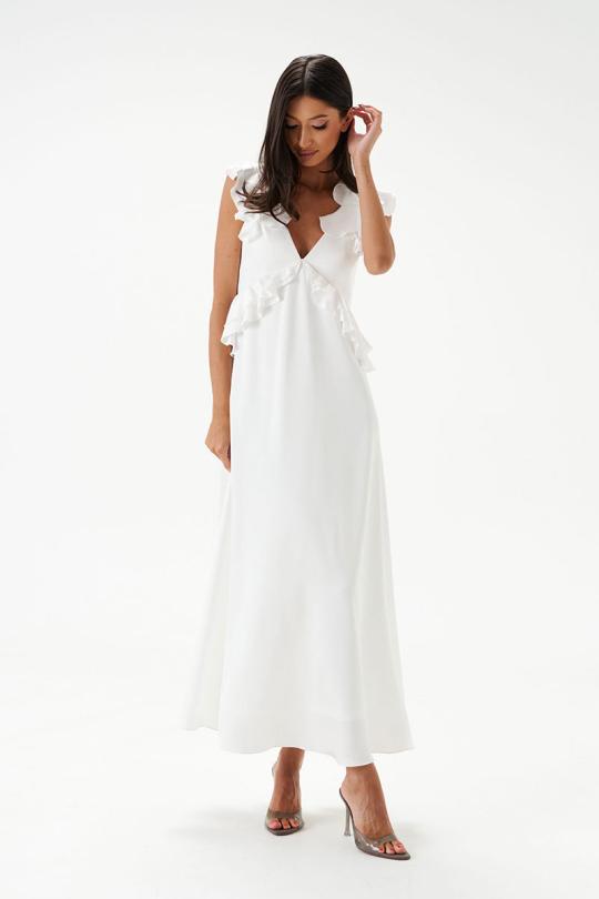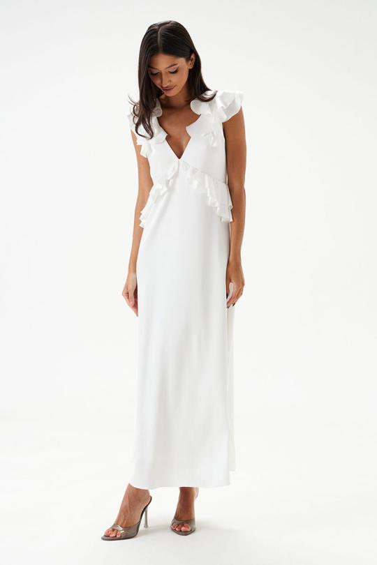 Платье полуприлегающего силуэта. Выполнено из мягкого струящегося полотна белого цвета. Вырез горловины V-образный. Лиф выполнен из двойной ткани. Выше линии талии (под грудью) фигурный отрез, декорирован рюшами, переходящими на спинку. По спинке отрез на резинке. По спинке декоративный вырез, над вырезом завязки. Плечо и горловина декорированы рюшами. Юбка в платье свободного кроя, с подкладкой.