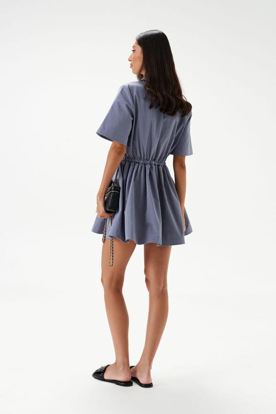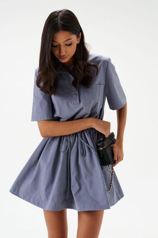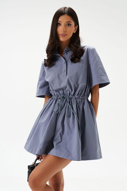 Платье свободного кроя. Выполнено из хлопкового полотна серо-голубого цвета. Без подкладки. Вырез горловины круглый. Воротник отложной, на стойке. Рукав втачной. Застёжка центральная – пуговицы. Слева по линии груди накладной карман. По линии талии отрез на резинке с кулисой со шнурком. Юбка в платье свободного кроя. В боковых швах карманы.