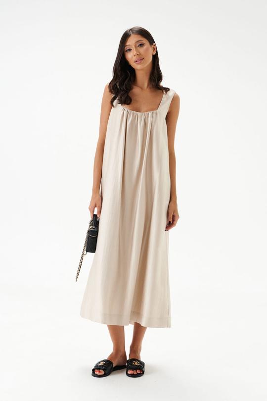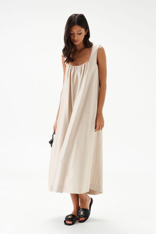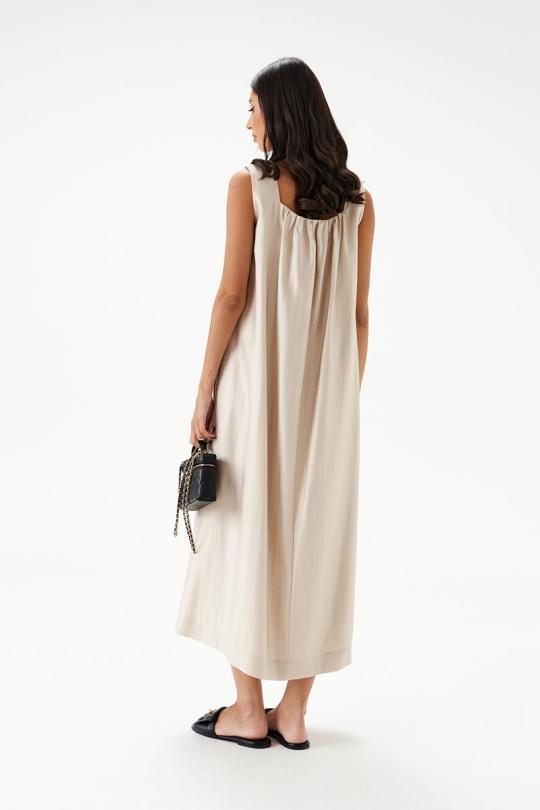 Платье А-силуэта, выполнено из трикотажного полотна песочного цвета с перламутровым отливом. Без подкладки. Квадратный вырез горловины присборен. В боковых швах карманы-хулиганы.