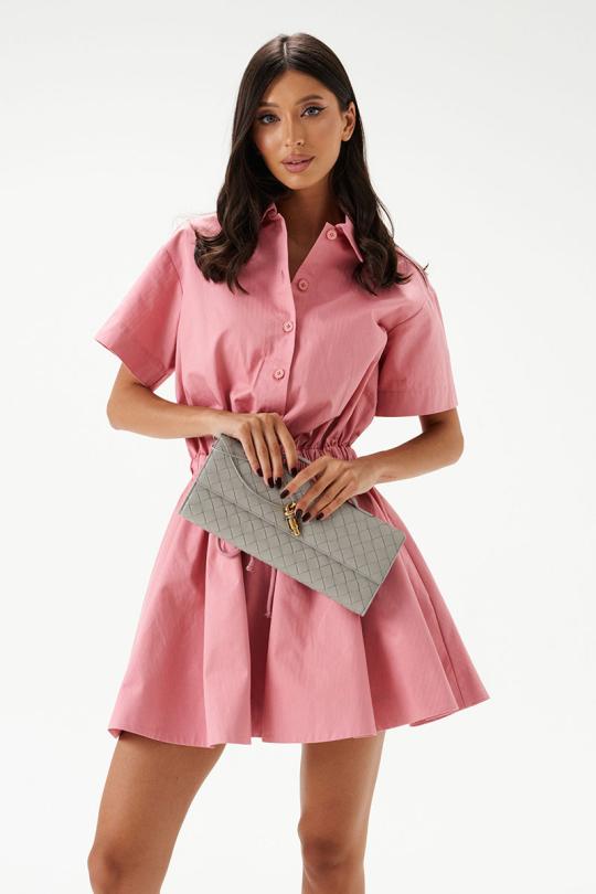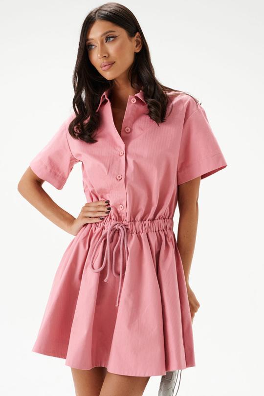 Платье полуприлегающего силуэта, из текстильного полотна розового цвета. Характеристики: полуприлегающий силуэт, по линии талии вставлена кулиса , присборена на резинку, воротник отложной, застежка центральная на планке на петли пуговички, рукав втачной, укороченный. Юбка на подкладке, свободного кроя, в боковых швах карманы.