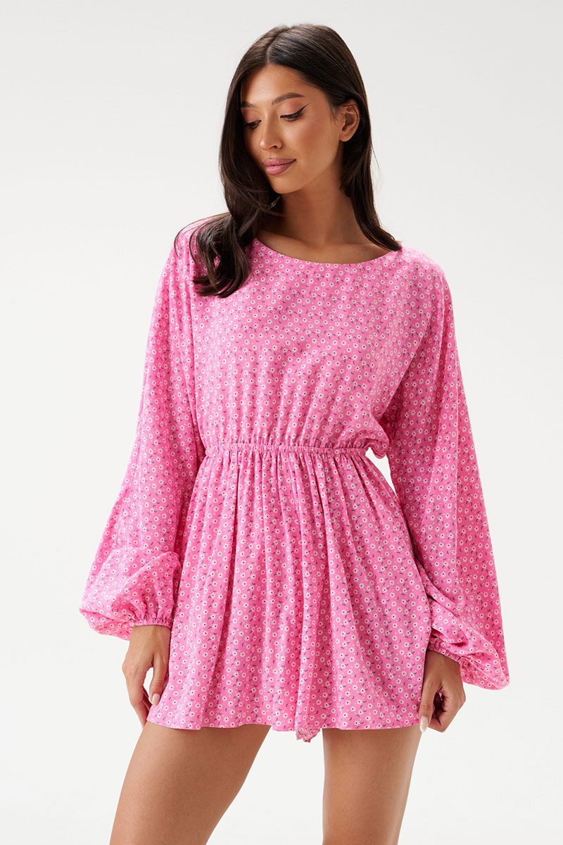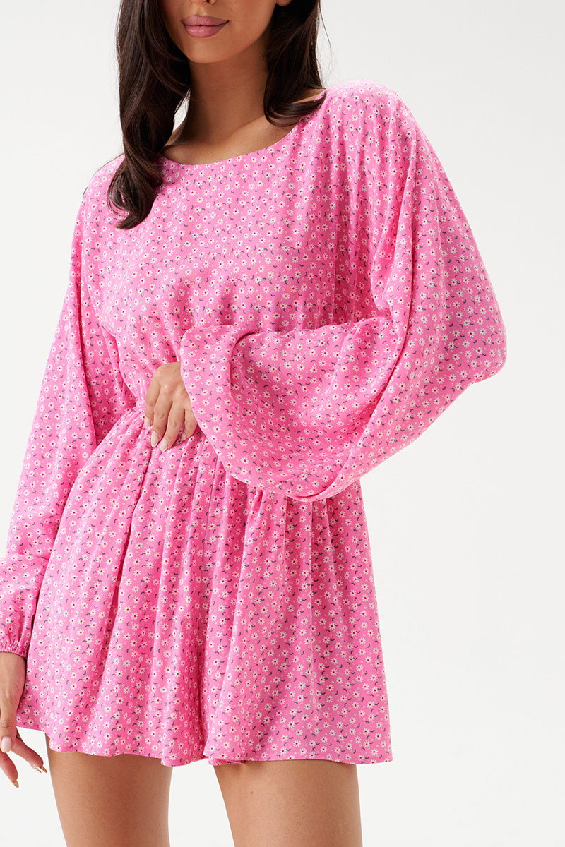 Платье - мини полуприлегающего силуэта выполнено из розового полотна с белым цветочным принтом. Горловина овальная. Отрез ниже талии на резинке. По лифу спинки вырез с завязками. Рукав спущенный, присборен на резинку.