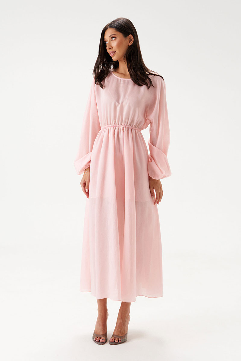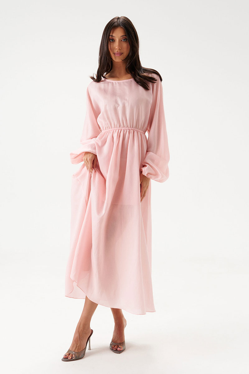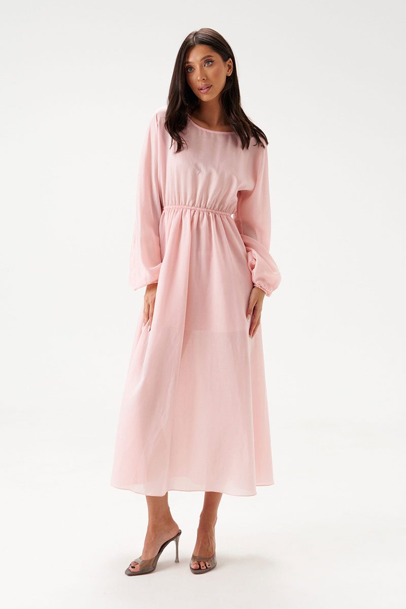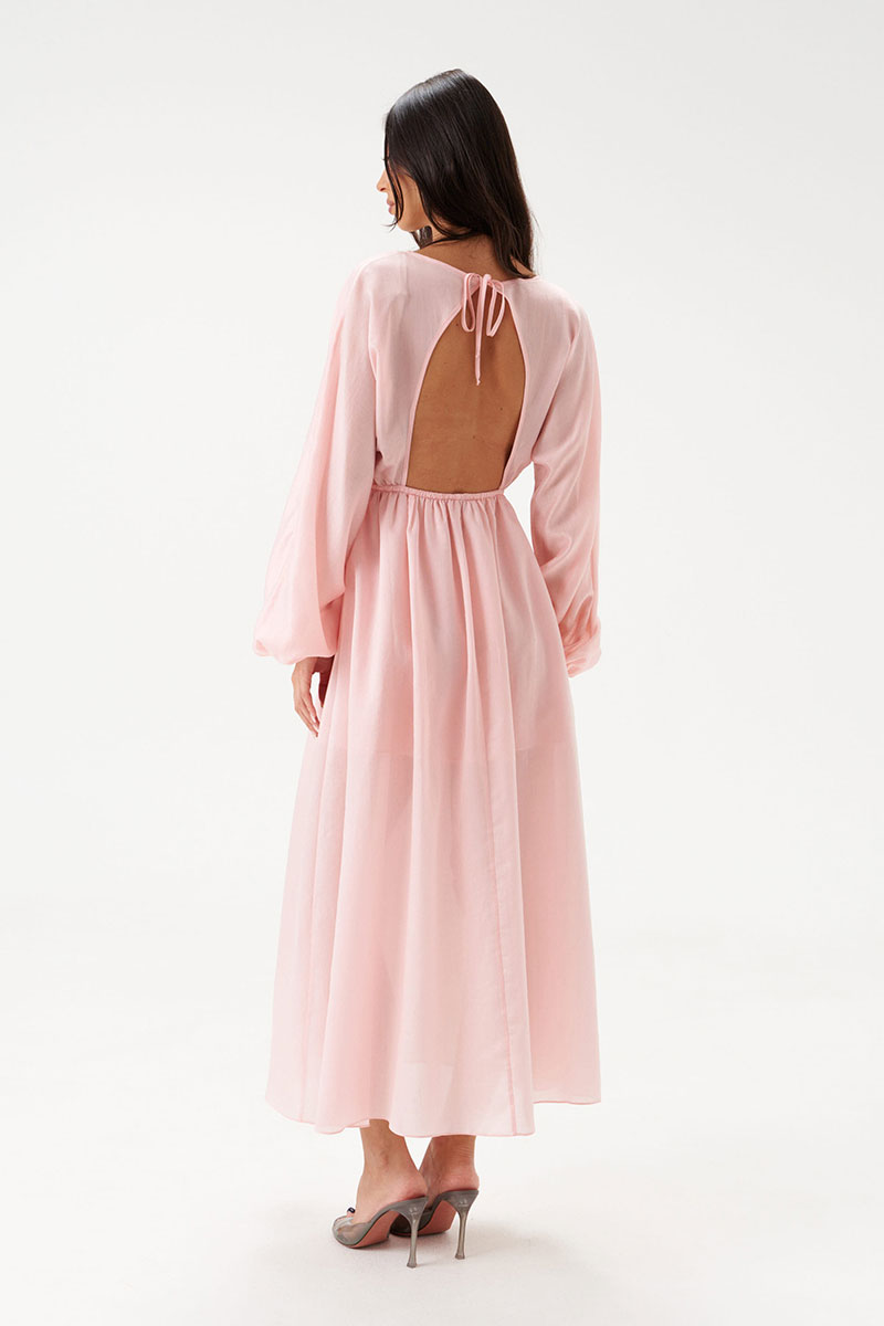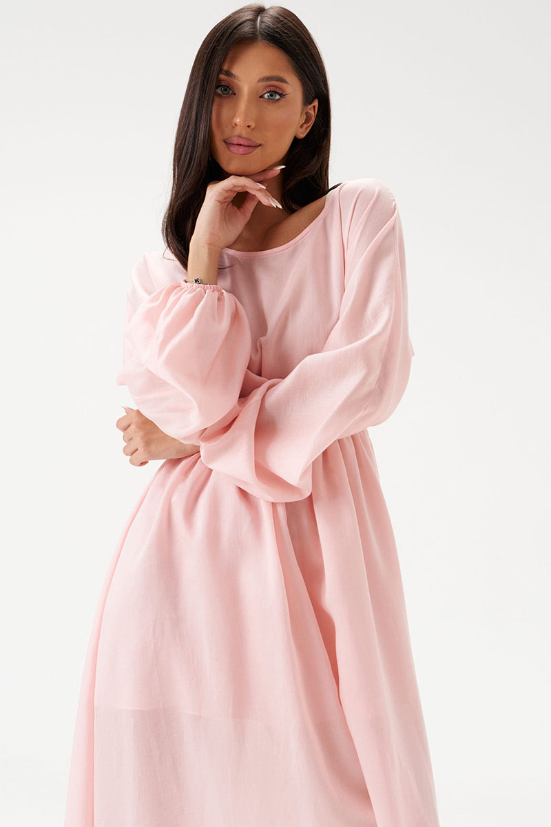 Платье-миди полуприлегающего силуэта выполнено из розового полотна. Горловина овальная. Отрез ниже талии на резинке. По лифу спинки вырез с завязками. Рукав спущенный, присборен на резинку.