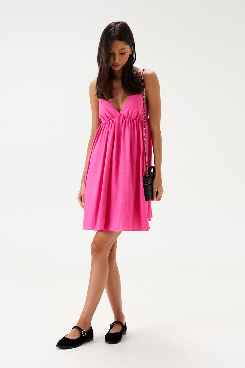 Платье свободного кроя. Выполнено из льняного полотна цвета фуксия. Характеристики: юбка-солнце, на подкладке, по спинке сборка на резинке.