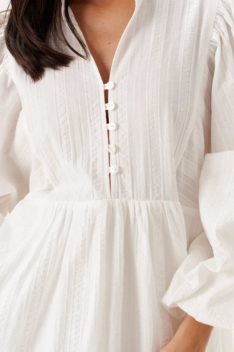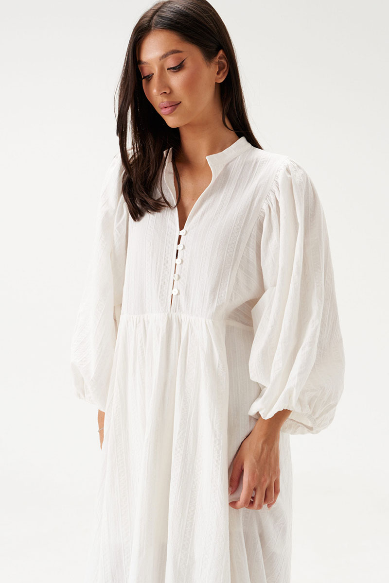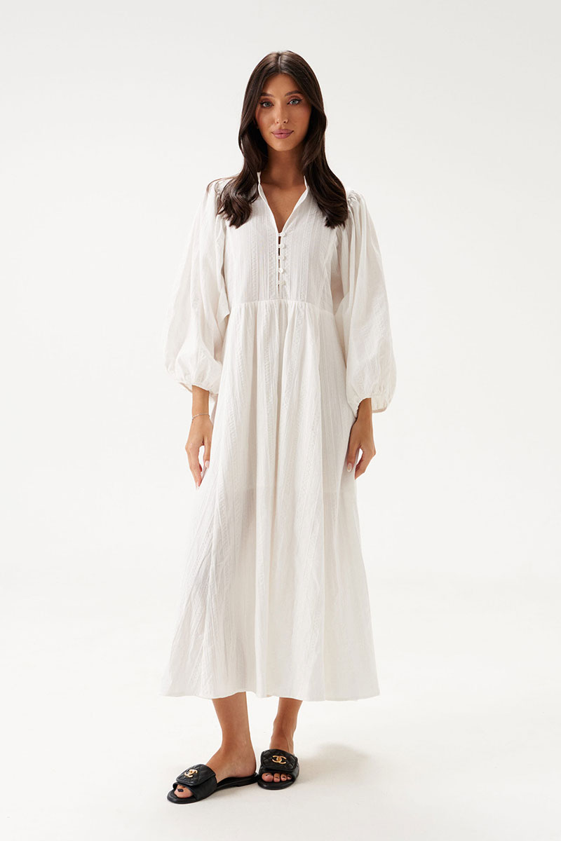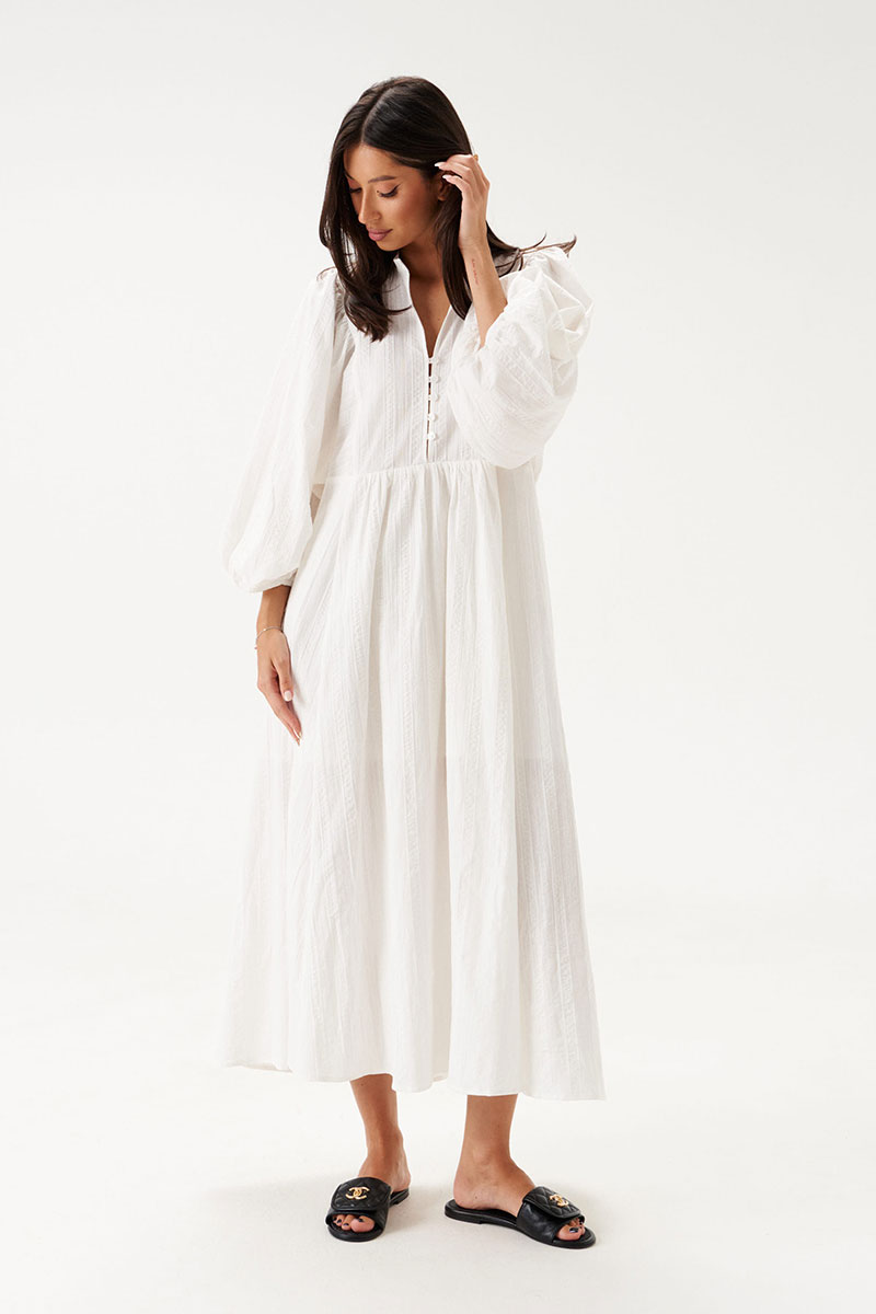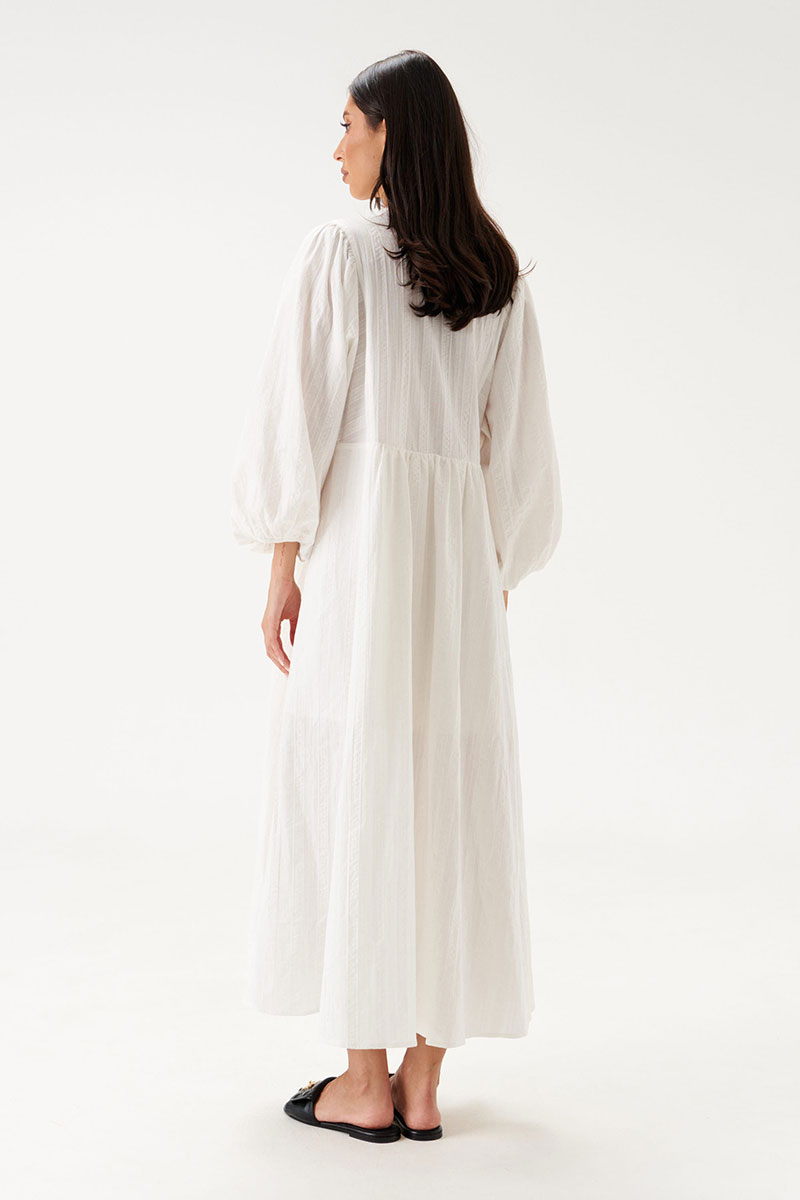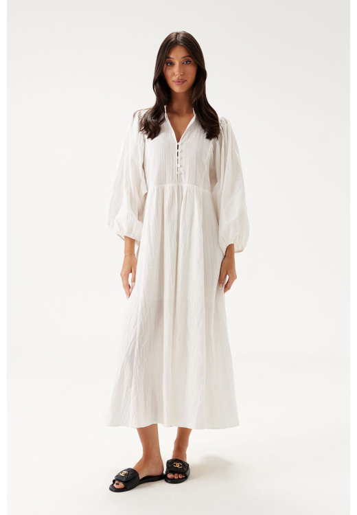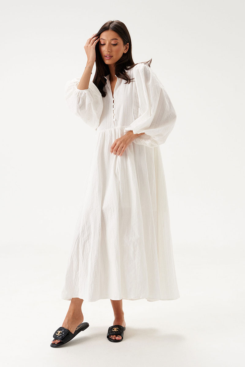 Платье выполнено из хлопкового полотна белого цвета. Характеристики: воротник-стойка, застежка центральная на пуговицы, рукав втачной "летучая мышь" на резинке , отрезное по поясу, юбка-трапеция, на подкладке.