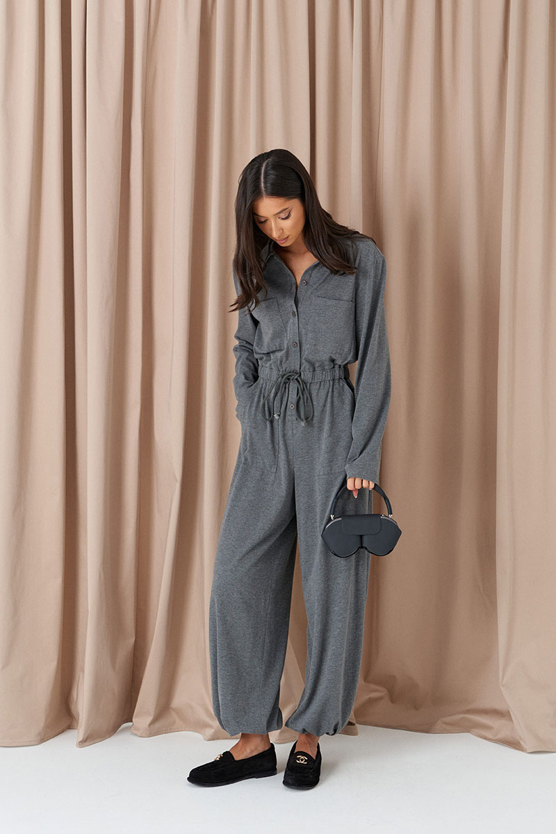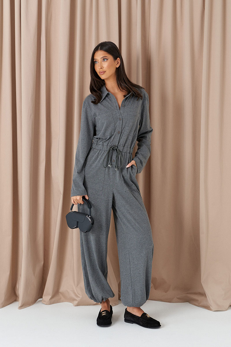 Комбинезон полуприлегающего силуэта выполнен из трикотажа серого цвета. Характеристики: отложной воротник, центральная застежка на петли-пуговицы, талия отрезная на резинке дополнительно на кулиске, на груди и ниже талии расположены карманы, низ брючен на затягивающейся резинке с фиксатором, рукав вточной.