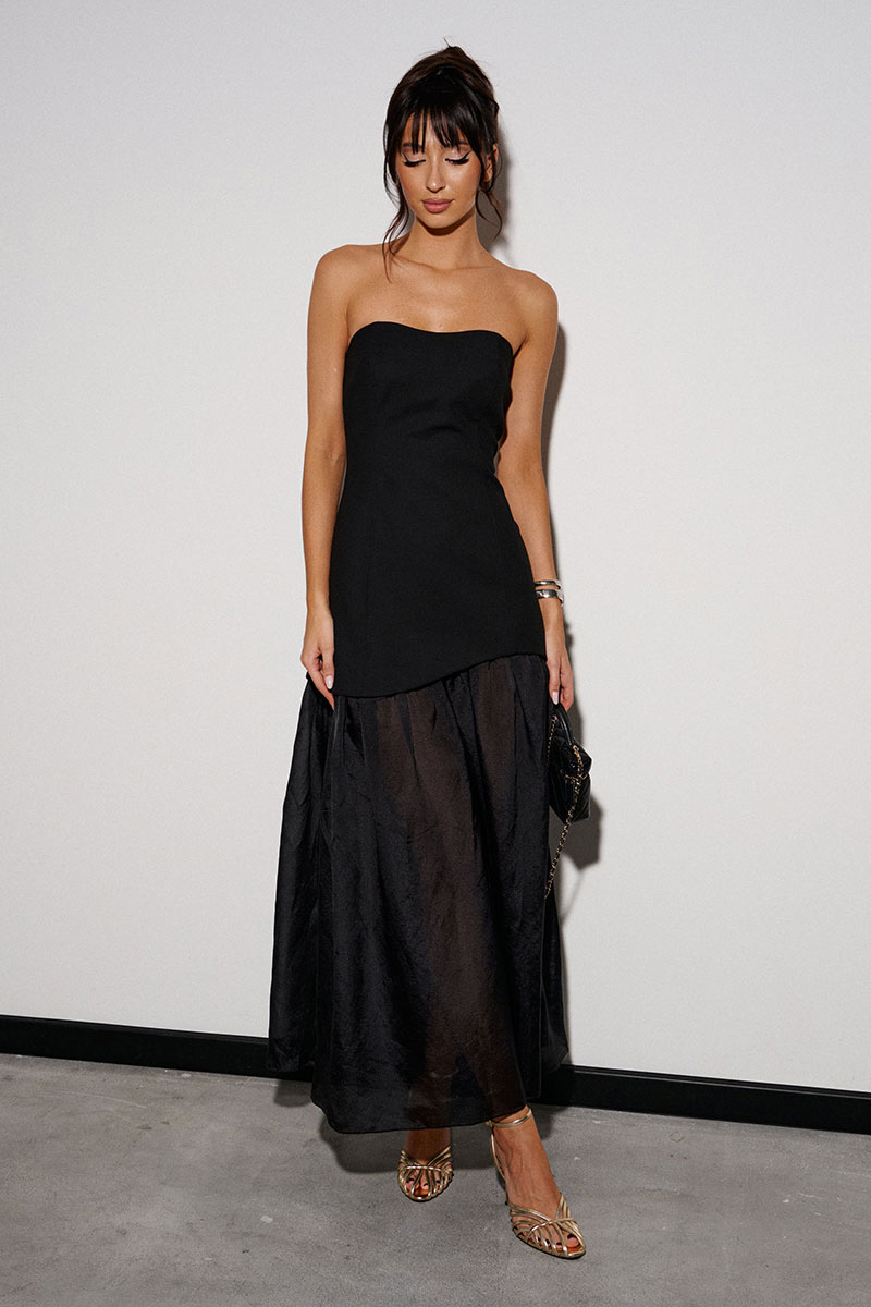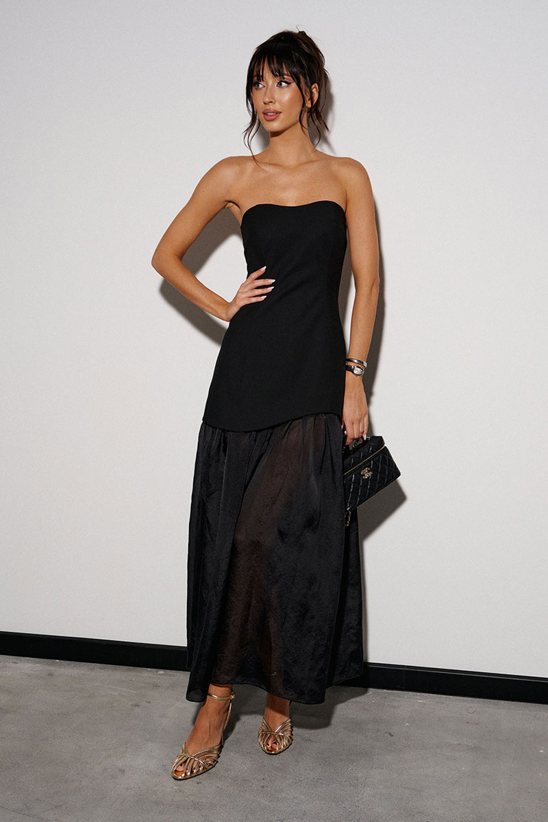 Платье выполнено из черной костюмной ткани и мягкой органзы. Характеристики: верх корсетного типа, на брендированной подкладке, юбочная часть выполнена из мягкой органзы, сзади по центру потайная молния.