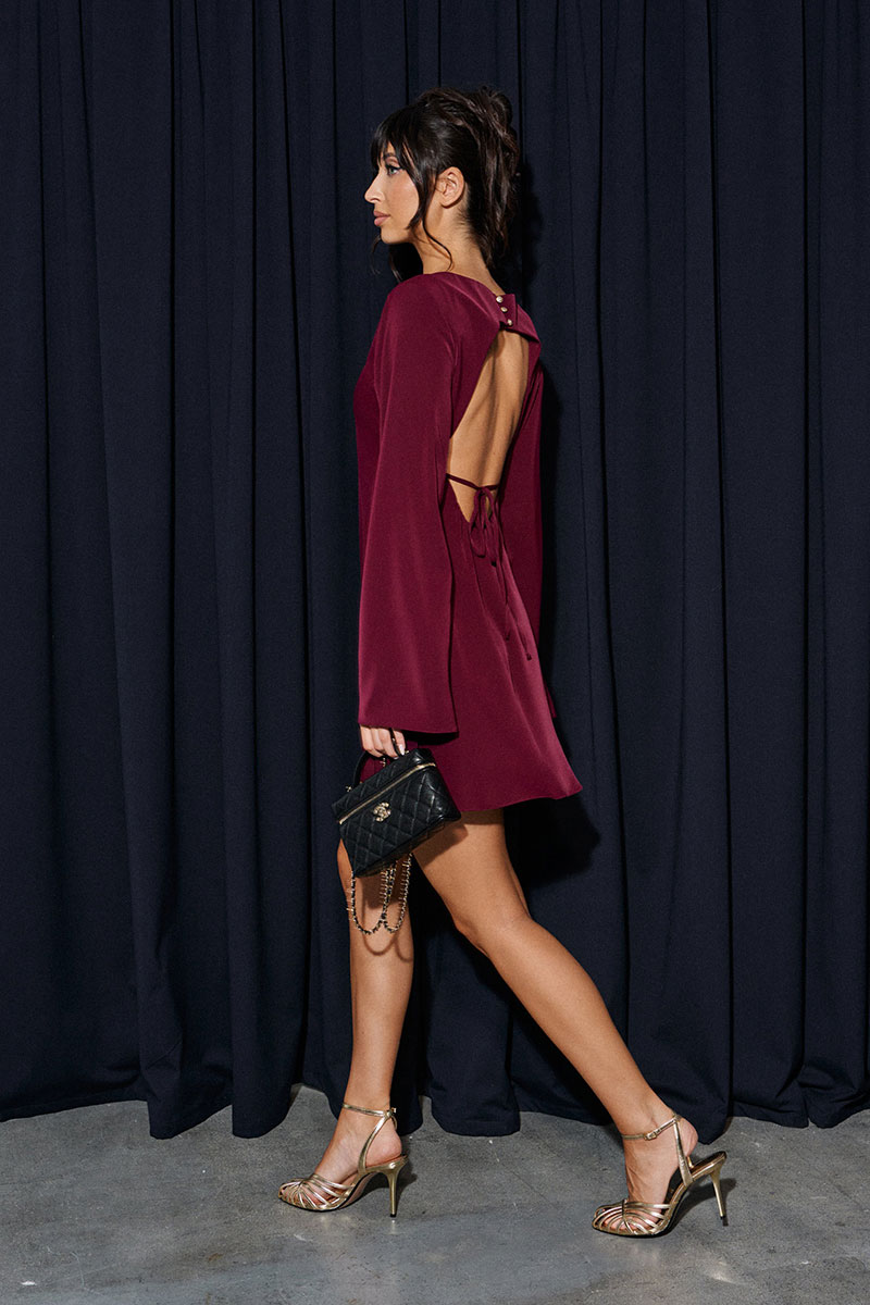 Платье полуприлегающего силуэта выполнено из плательной струящейся ткани бордового цвета. Характеристики: полуприлегающий силуэт, овальная горловина, рукав втачной расклешеный, тонкий подклад. Спинка открытая, с декоративным элементом завязок, сверху застежка на петли пуговицы.