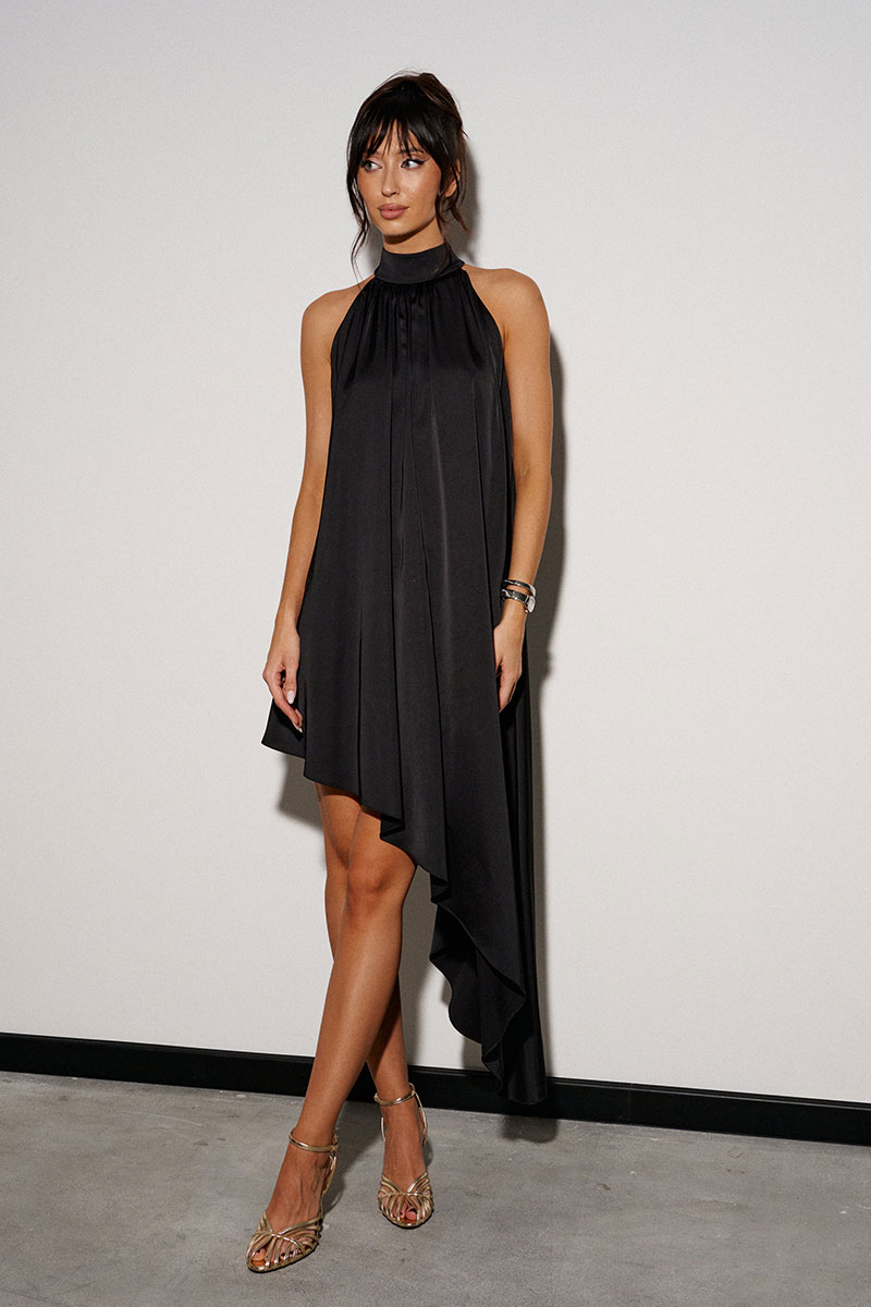 Платье-мини свободного кроя с асимметрией. Выполнено из мягкой струящейся ткани чёрного цвета. С подкладкой. Воротник стойка. В среднем шве заднего полотна вырез "капелька". Застёжка на стойке - пуговицы с петельками.