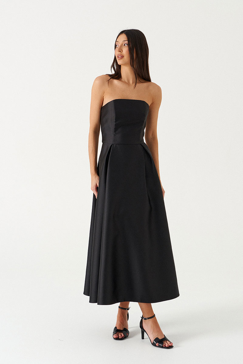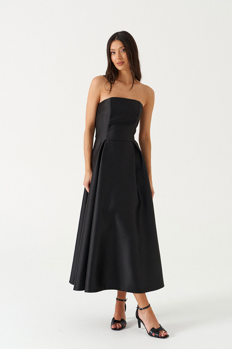 Платье полуприталенное, выполнено из ткани черного цвета с блеском. Характеристики: А-образный силуэт, лиф корсетный, прямой вырез, отрезная, брендированная подкладка, в ценральном шве на спинке потойная молния, по переду и спинке лифа вытачки.