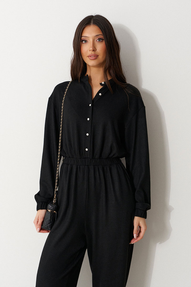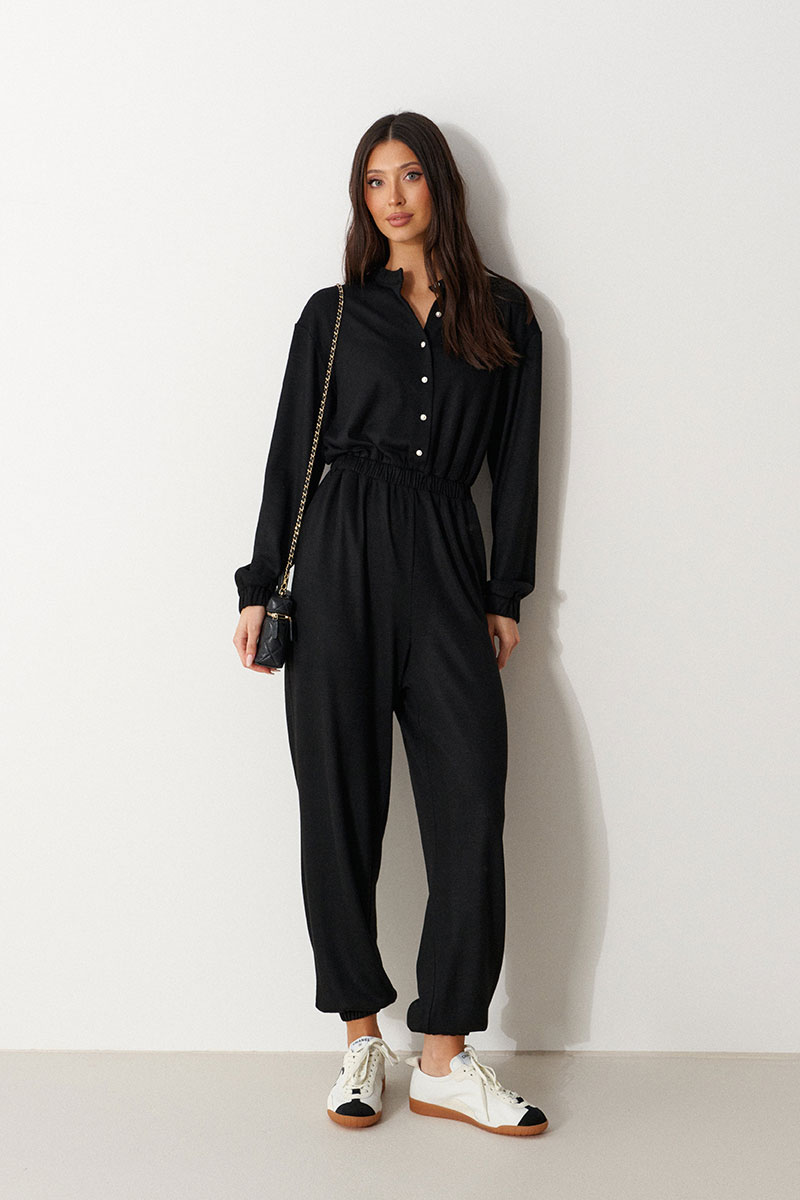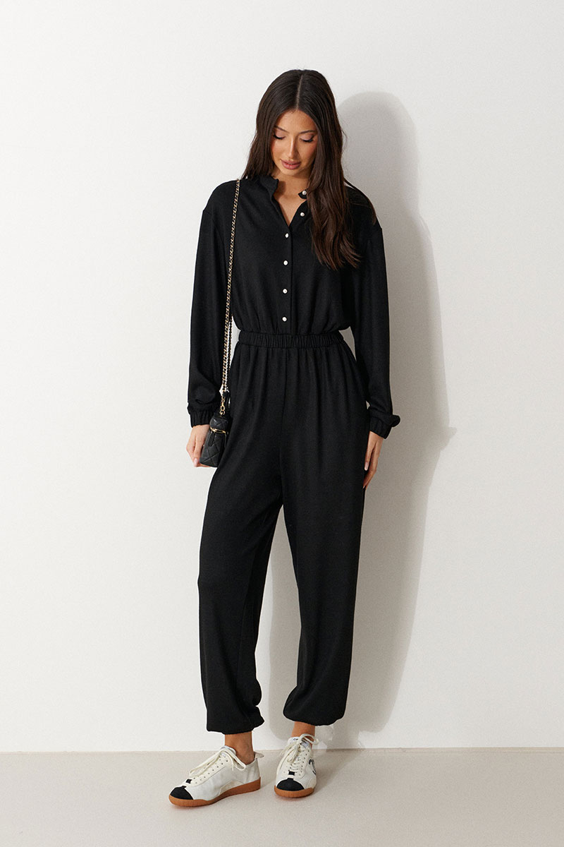 Комбинезон свободного кроя. Выполнен из трикотажа черного цвета. Без подкладки. Вырез горловины круглый. Воротник стойка. Застёжка центральная - пуговицы. Рукав втачной, спущенный, с манжетом на резинке. Пояс на резинке. Брюки с манжетом на резинке. В брючинах наклонные карманы.