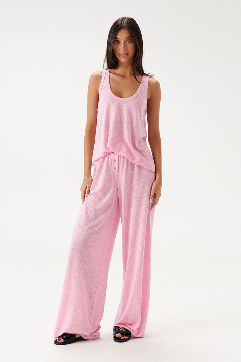 Комплект состоит из туники и брюк, выполнен из полупрозрачного трикотажного полотна розового цвета.
