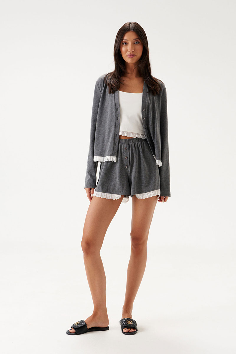 Комплект с шортами выполнен из трикотажного полотна серого цвета.