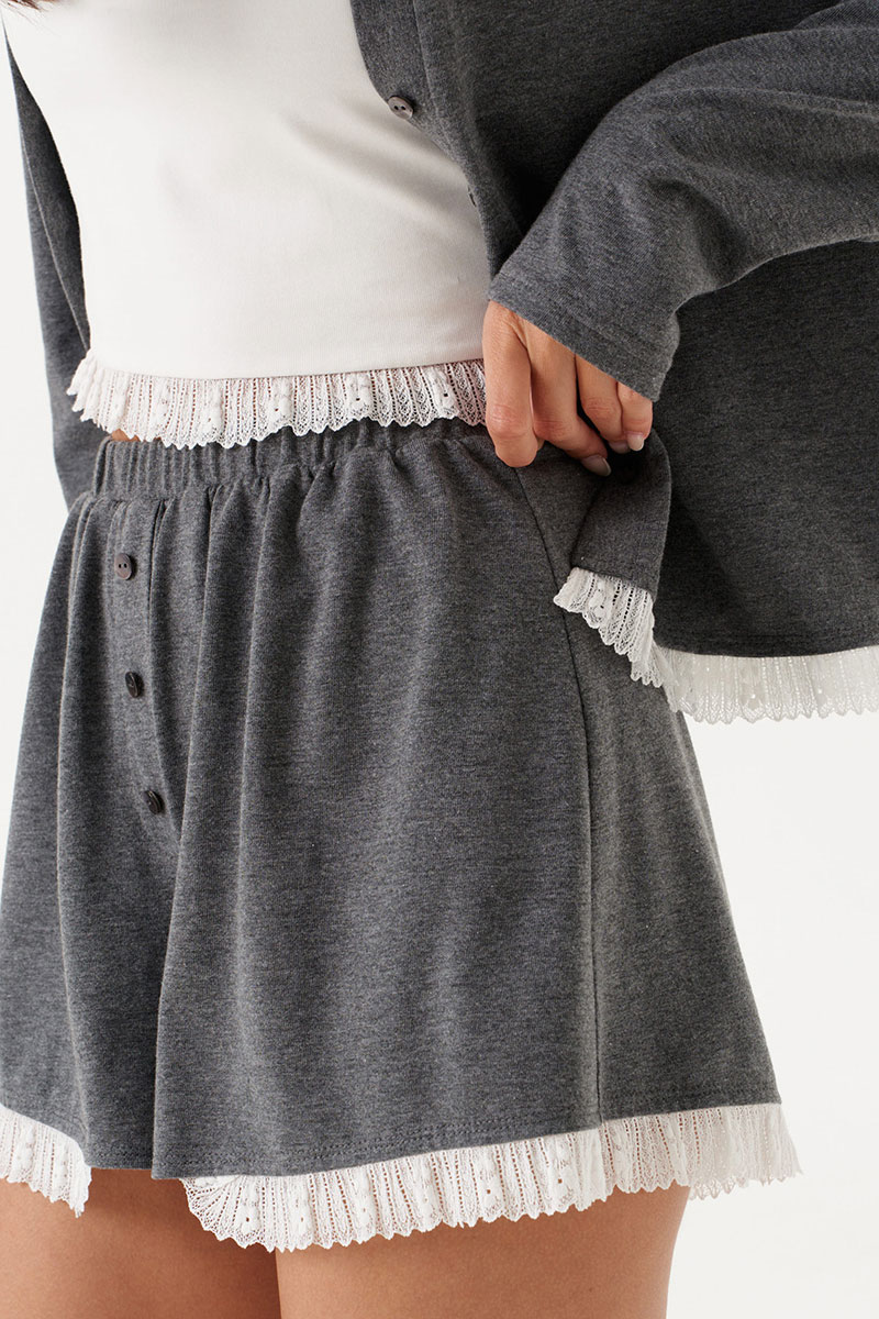 Шорты свободного кроя. Пояс на резинке. По передней части имитация застежки на 3 пуговицы. По низу нашито декоративное кружево.