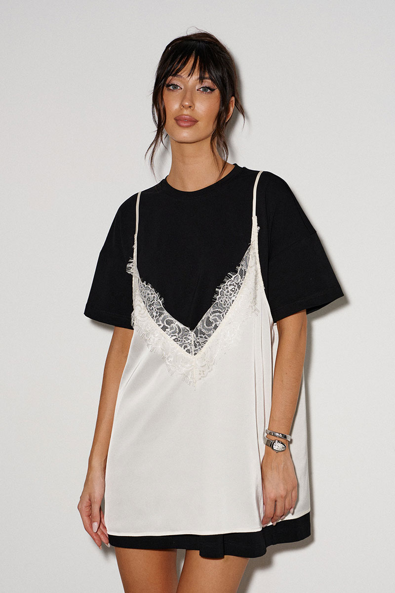 Комплект из двух платьев. Основное платье выполнено из трикотажного полотна чёрного цвета. Вырез горловины круглый. Рукав втачной, спущенный. Верхнее платье свободного кроя, выполнено из струящегося полотна цвета айвори. Платье декорировано кружевом по верху и низу изделия. Вырез декольте V-образный. Бретели регулируемые.