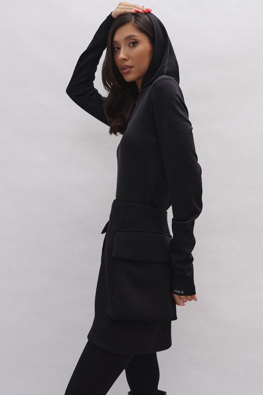 Юбка полуприлегающего силуэта с крупными накладными карманами выполнена из полотна черного цвета. Характеристики: полуприлегающий силуэт, А образный крой, подкладка, застежка потайная тесьма молния в среднем шве заднего полота изделия, по бокам юбки крупные накладные карманы с клапаном.