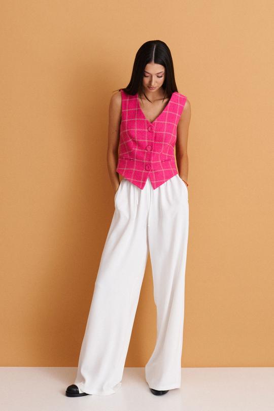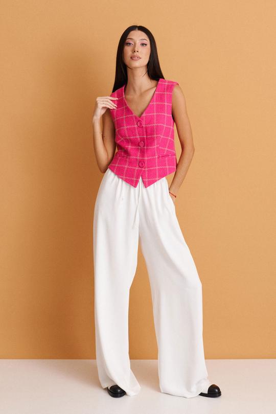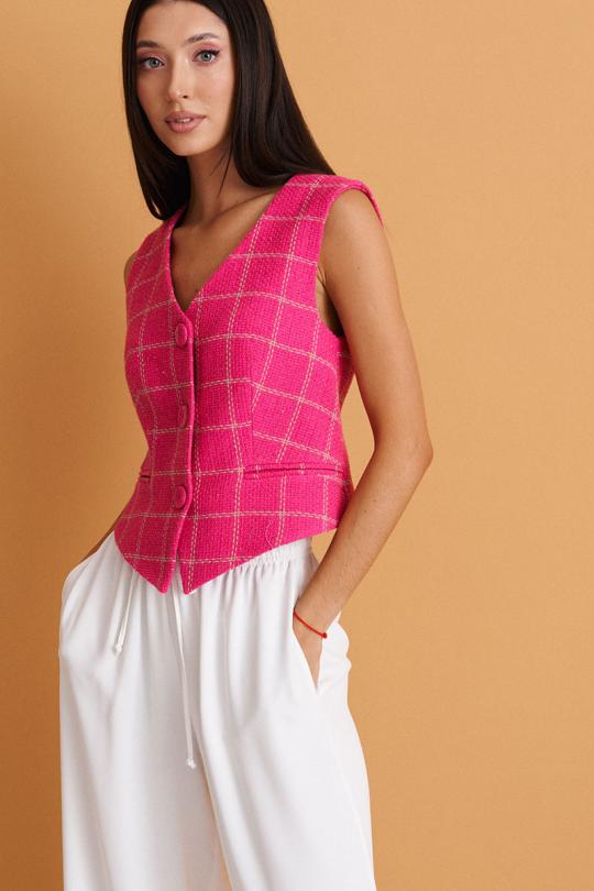 Стильный жилет прямого кроя выполнен из фактурного розового полотна с контрастный строчкой. Характеристики: однобортный, прямой крой, подкладка, V-образный вырез горловины прорезные карманы обманки, застежка центральная на петли - пуговицы, пуговицы декорированы тканью основного изделия, низ изделия по переду с фигурным низом.
