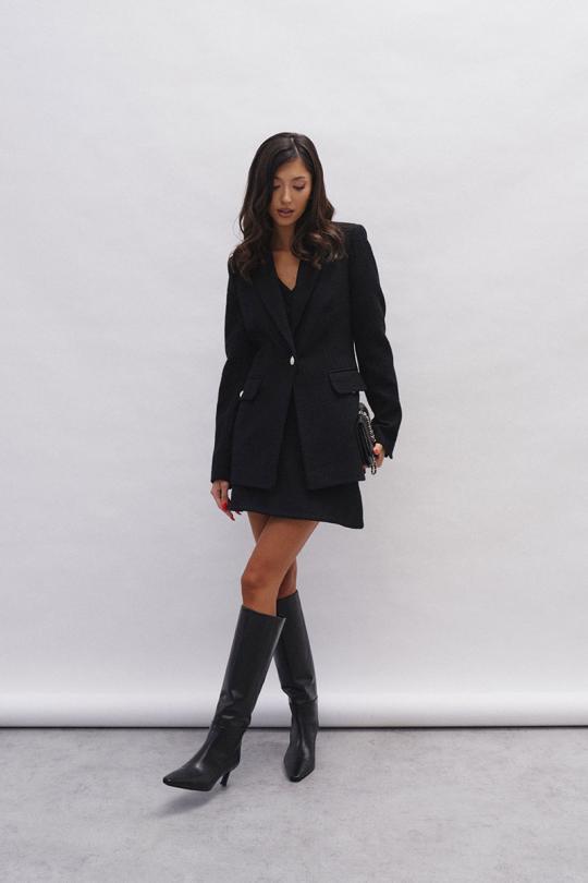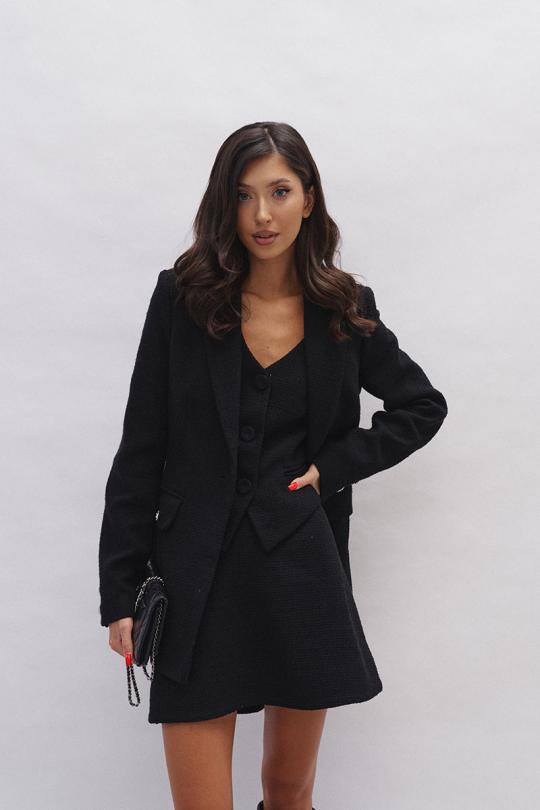 Жакет прилегающего силуэта выполнен из фактурной ткани черного цвета. Характеристики: прилегающий силуэт, однобортный, подплечники, подкладка, отложной воротник с лацканом, застежка центральная на петлю пуговичку, рукав втачной, по низу рукава пуговички, по переду прорезные карманы с клапаном на пуговичке, пуговички в изделии крупные металлические.