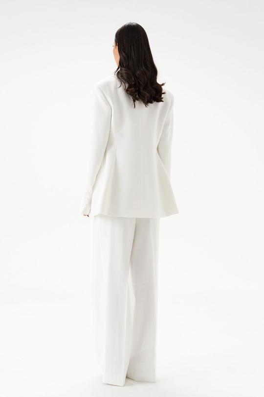 Жакет приталенного силуэта. Выполнен из текстильной ткани. С подкладкой. Воротник пиджачного типа с лацканами. На переде по линии талии карманы в рамку с клапаном. Рукав втачной. Локтевой шов заканчивается шлицей, с имитацией застегивания на петли и пуговицы. Застежка центральная на петли и пришивные пуговицы.