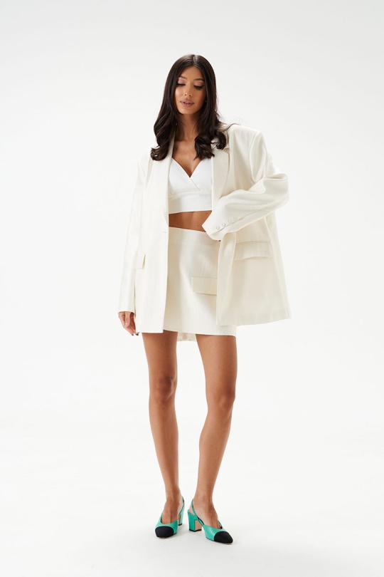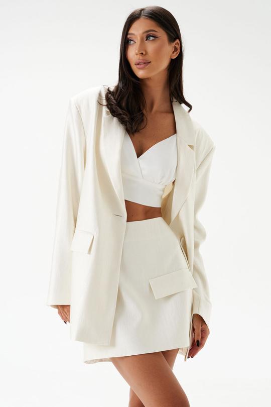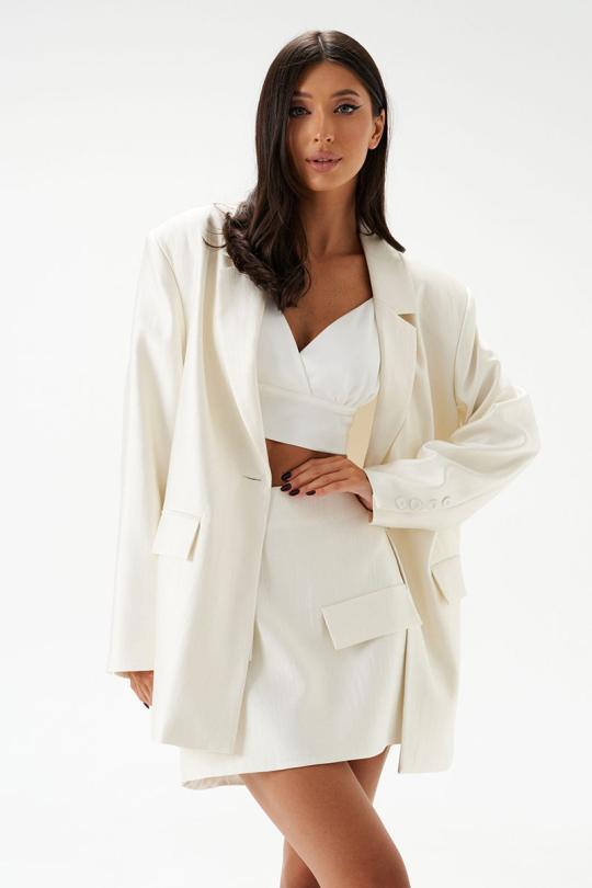 Жакет прямого свободного кроя выполнен из костюмной ткани молочного цвета. Характеристики: прямой свободный крой, подкладка, подплечники, воротник с остроугольным лацканом, застежка центральная на петлю - пуговицу, по переду функциональные карманы с клапаном, рукав втачной, по низу рукава нашиты пуговички, спинка со средним швом, в среднем шве шлица 48 см.